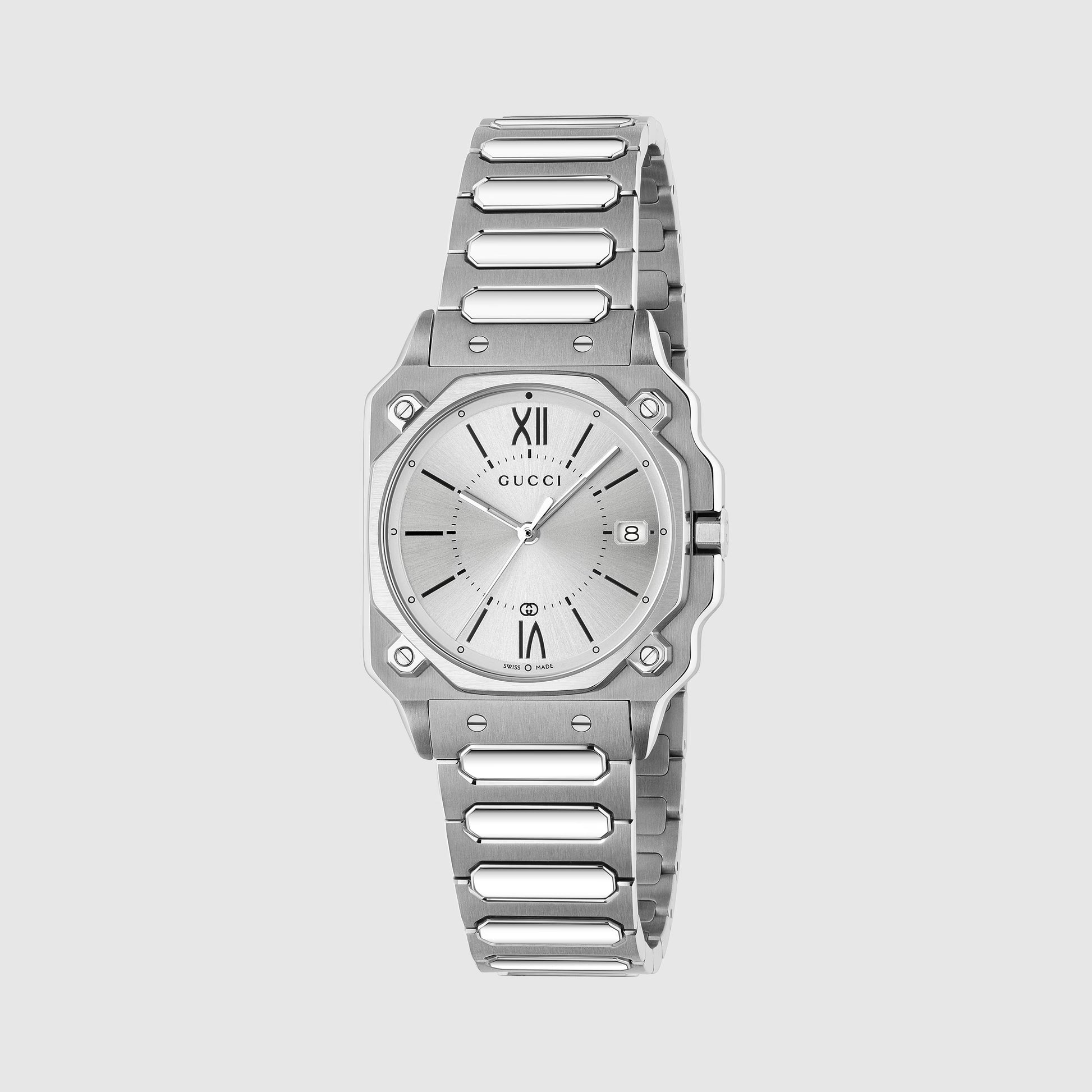 First introduced in the 1970s, the G-Flat watch pays homage to the heritage designs of the House with a modern touch. Characterized by octagonal angles and a multi-layered profile, the watch evokes the architectural landscape of the 1970s. This watch appears in stainless steel with silver galvanized dial, roman indexes and date opening.