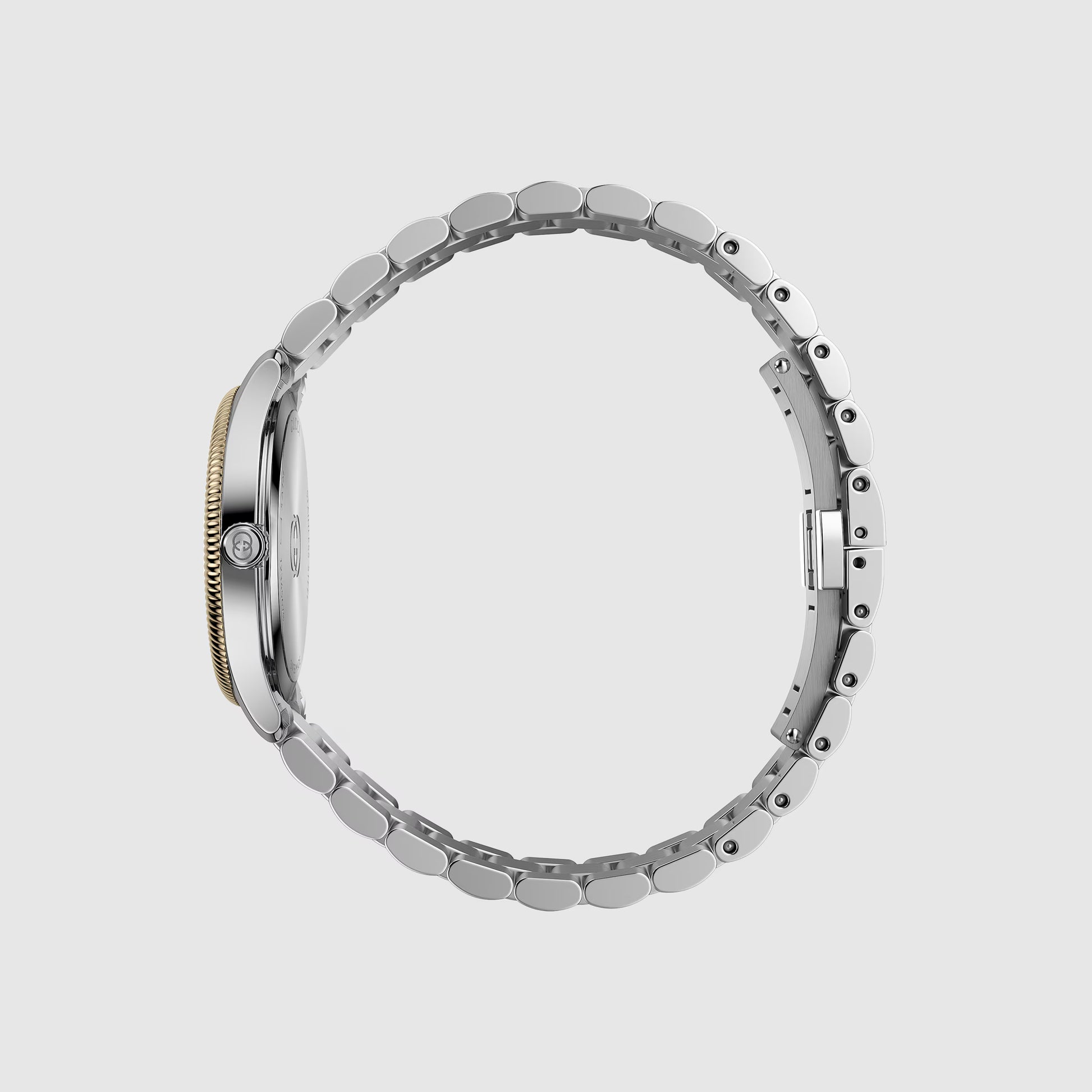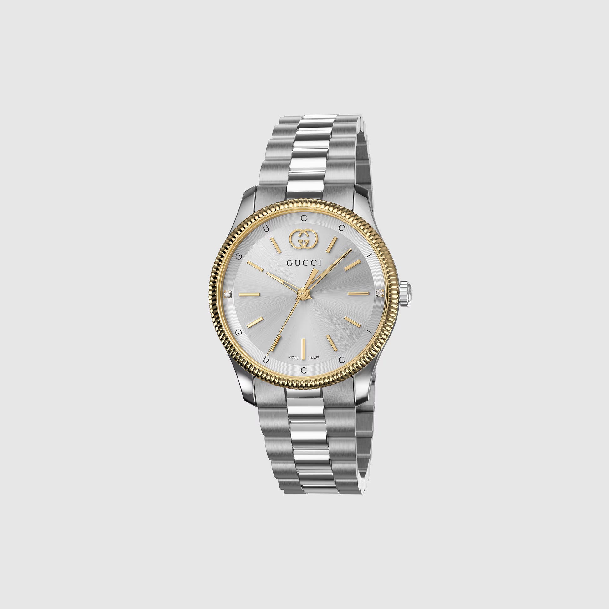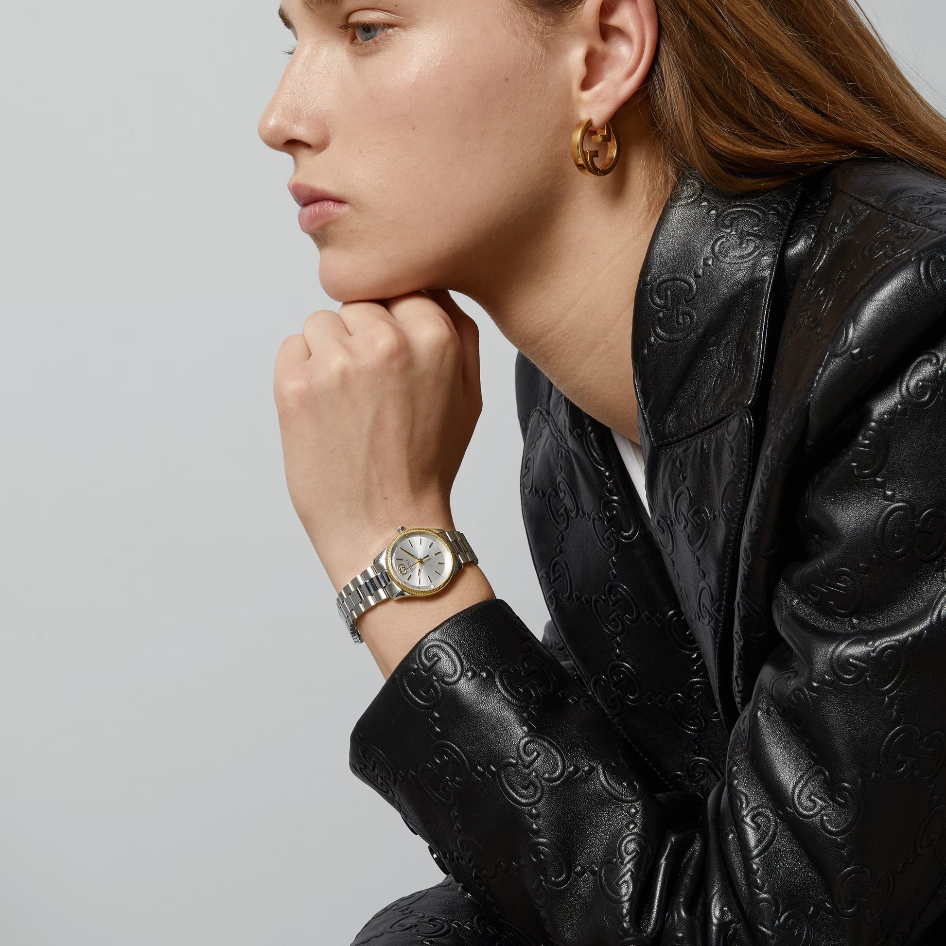 The season's polished look extends to watches and jewelry, including the G-Timeless collection. The round watch spotlights a sleek dial finish with subtle expressions of the Interlocking G and the Gucci lettering. Designed with a silver dial, the accessory is further enriched with signature motifs of the House.