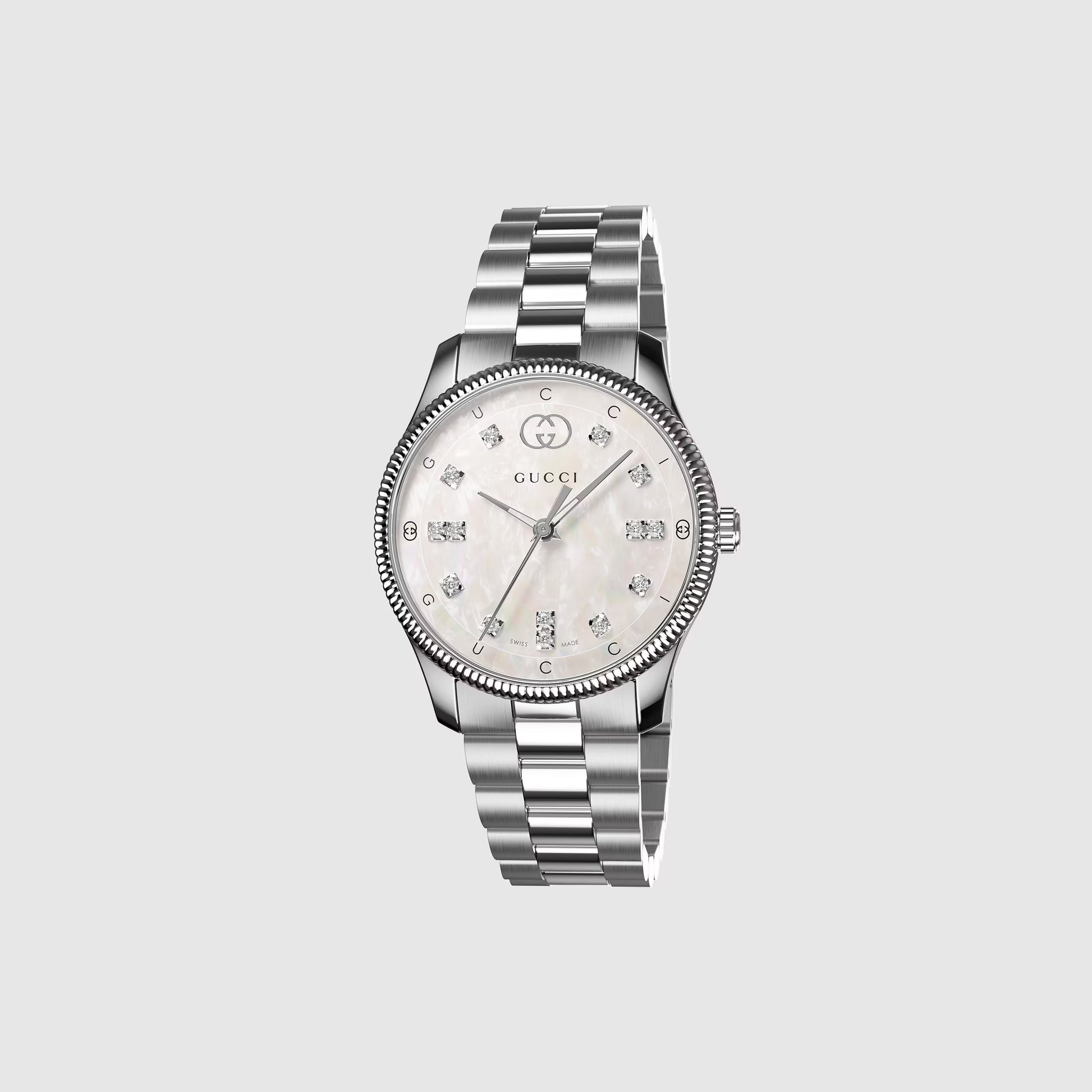 The season's polished look extends to watches and jewelry, including the G-Timeless collection. The round watch spotlights a sleek dial finish with subtle expressions of the Interlocking G, Gucci lettering and signature motifs. Designed with a white mother of pearl dial, the accessory is further enriched with diamond indexes.
