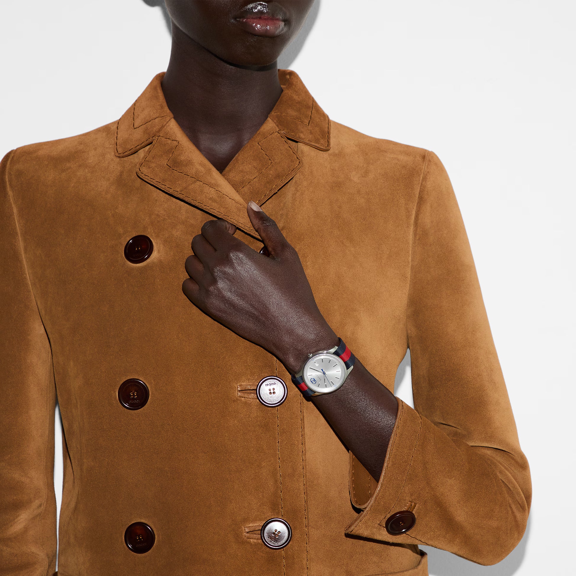 The G-Timeless line continues to define the latest collections, highlighting the signature motifs of the House. Presented with a blue and red nylon strap, the accessory features a stainless steel case and a silver-toned dial enriched with emblematic codes.