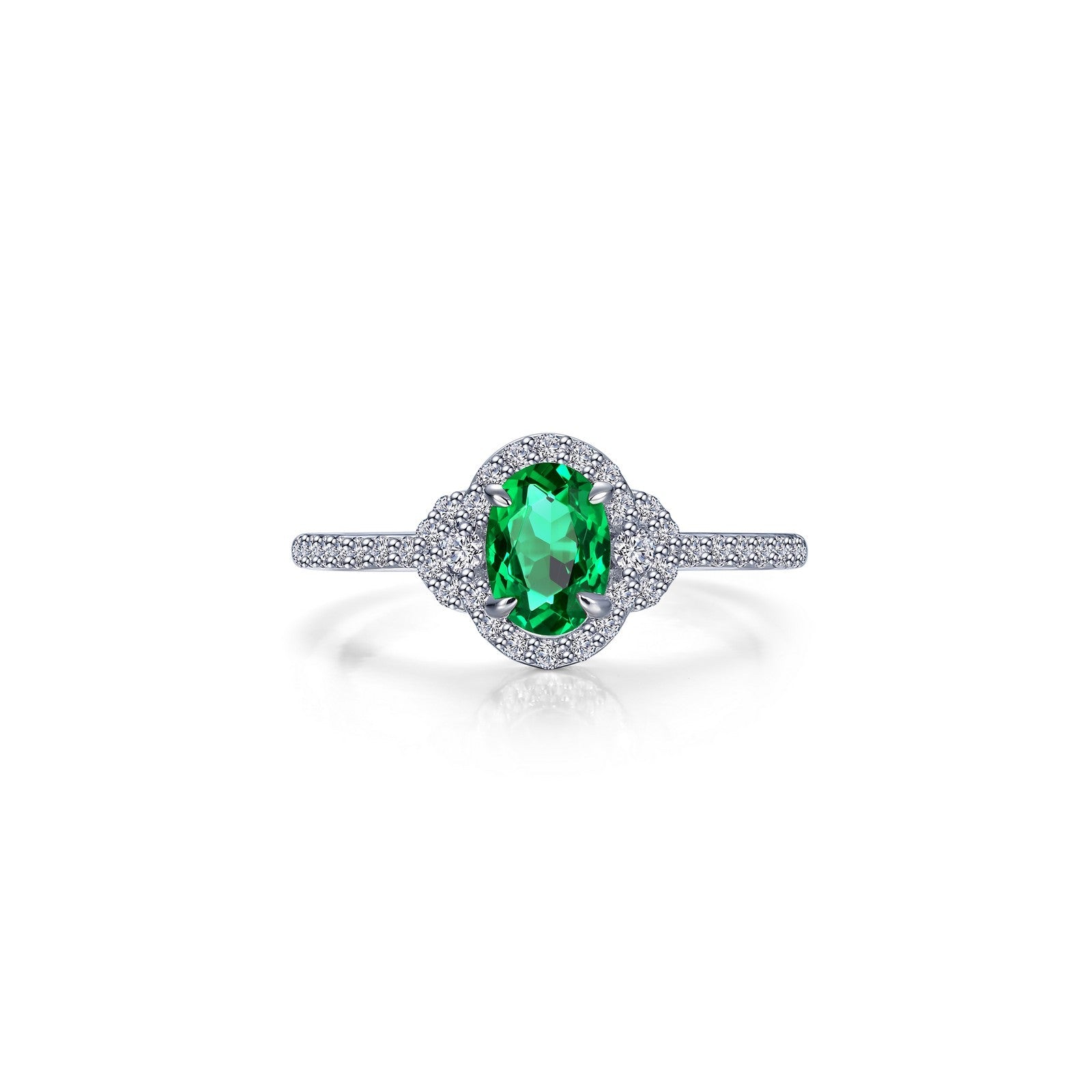 Simple and chic. This charming halo ring features an oval simulated emerald center stone surrounded by Lafonn's signature Lassaire simulated diamonds. The ring is in sterling silver bonded with platinum.