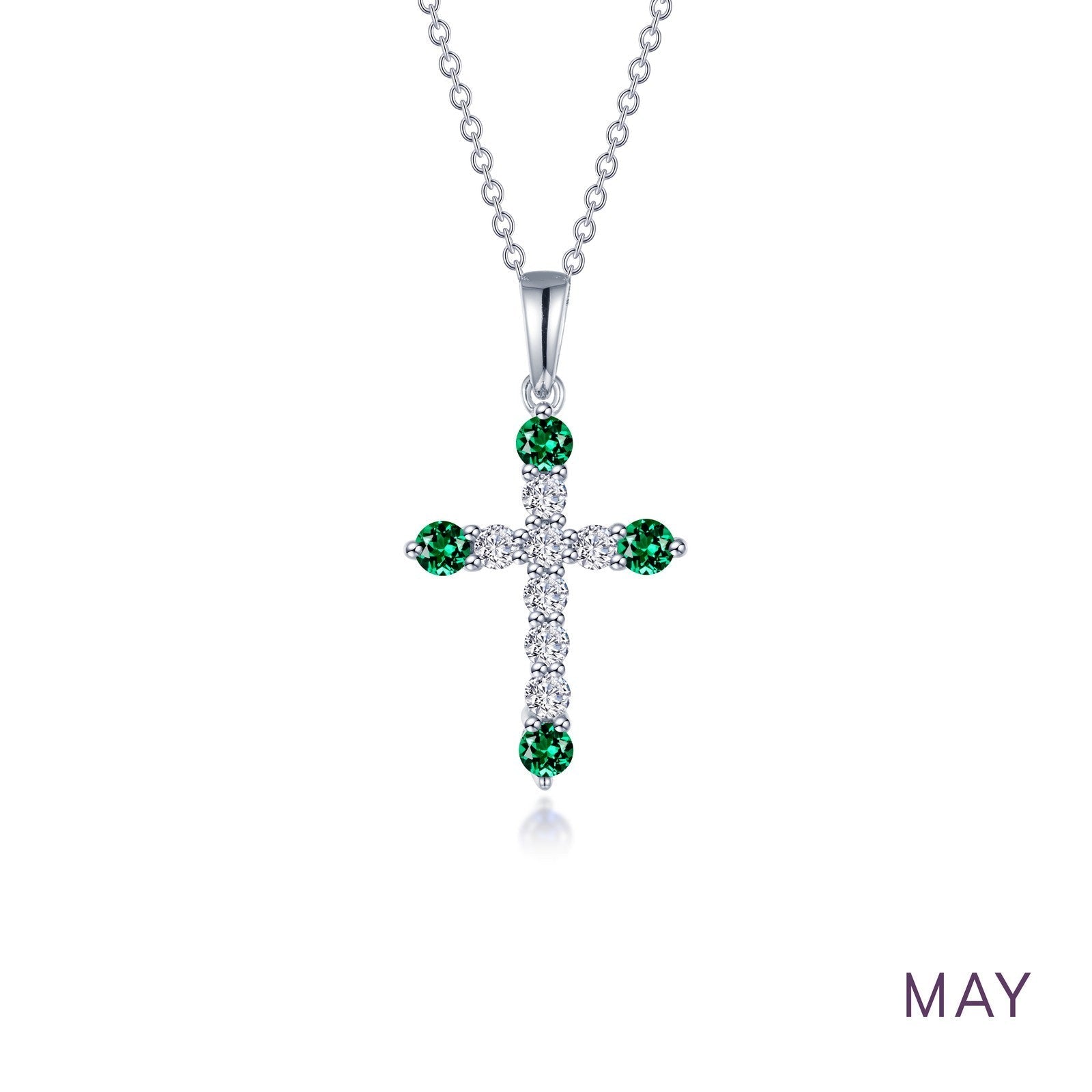 May - Emerald. Adorn yourself with Lafonn's birthstone jewelry. This cross pendant features Lafonn's signature Lassaire simulated diamonds and four simulated emeralds in sterling silver bonded with platinum. The pendant comes on an adjustable 20" chain.