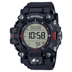 Conquer even more terrain with enhanced support — A rugged timepiece in a bold, powerful, triple-sensor design. The G-SHOCK Master of G line of watches developed for professionals working in the harshest environments introduces the triple-sensor MUDMAN with mud-resist construction. The large, easy to operate front button and three direct sensor buttons on the side are shaped to drain mud and water and are protected by cylinder-shaped stainless steel components. The button shafts are equipped with gasket fittings to keep mud and dust out, as well, so you’re ready to take on the toughest of terrains. The bold design features a dual-layer LCD, as well as the Triple Sensor to deliver altitude, direction, temperature and barometric pressure readings directly to your wrist. The thin module and Carbon Core Guard structure mean all these features live in a slimmer, more compact watch, for tough and rugged support with a comfortable fit. Slim, yet powerful, this MUDMAN design packs full-on functionality in a striking exterior built with an intricate combination of components. The digital compass is more practical than ever thanks to the dual-layer LCD, which displays compass graphics on the top layer and time and other readings on the layer below. The GW-9500-3 and GW-9500-1A4 feature a negative dual-layer LCD. Taking utility to a whole new level, radio-controlled solar power delivers precision timekeeping powered by light, while Super Illuminator ensures visibility, even in dark places. The case, bezel and urethane band are made with bio-based resins derived from renewable organic resources. The case back is engraved with the iconic MUDMAN mole character holding a compass.