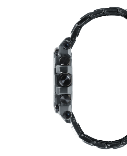 With its even more advanced Dual Core Guard structure, the MTGB3000 protects the module in a carbon-reinforced resin case and encloses the exterior in metal components. Repeated pressing, cutting, and polishing builds the stainless steel case back upward into an intricate 3D form. The case back also serves as the lugs to secure the band and as the guards for crown and buttons, for a completely new structure. Using high-density mounting technology, we developed a new slimmer, multi-function module. All of these innovative designs and technologies created a much thinner watch, measuring just 12.1 mm from bezel to case back.