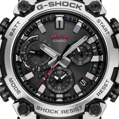 The MTGB3000D features an even lighter layered composite band made of stainless steel and fine resin. Its stainless steel bezel is ion plated in black, then treated with a hairline finish to expose the stainless steel below the convex surfaces only. These meticulous details come together to offer an intricate and sophisticated design.