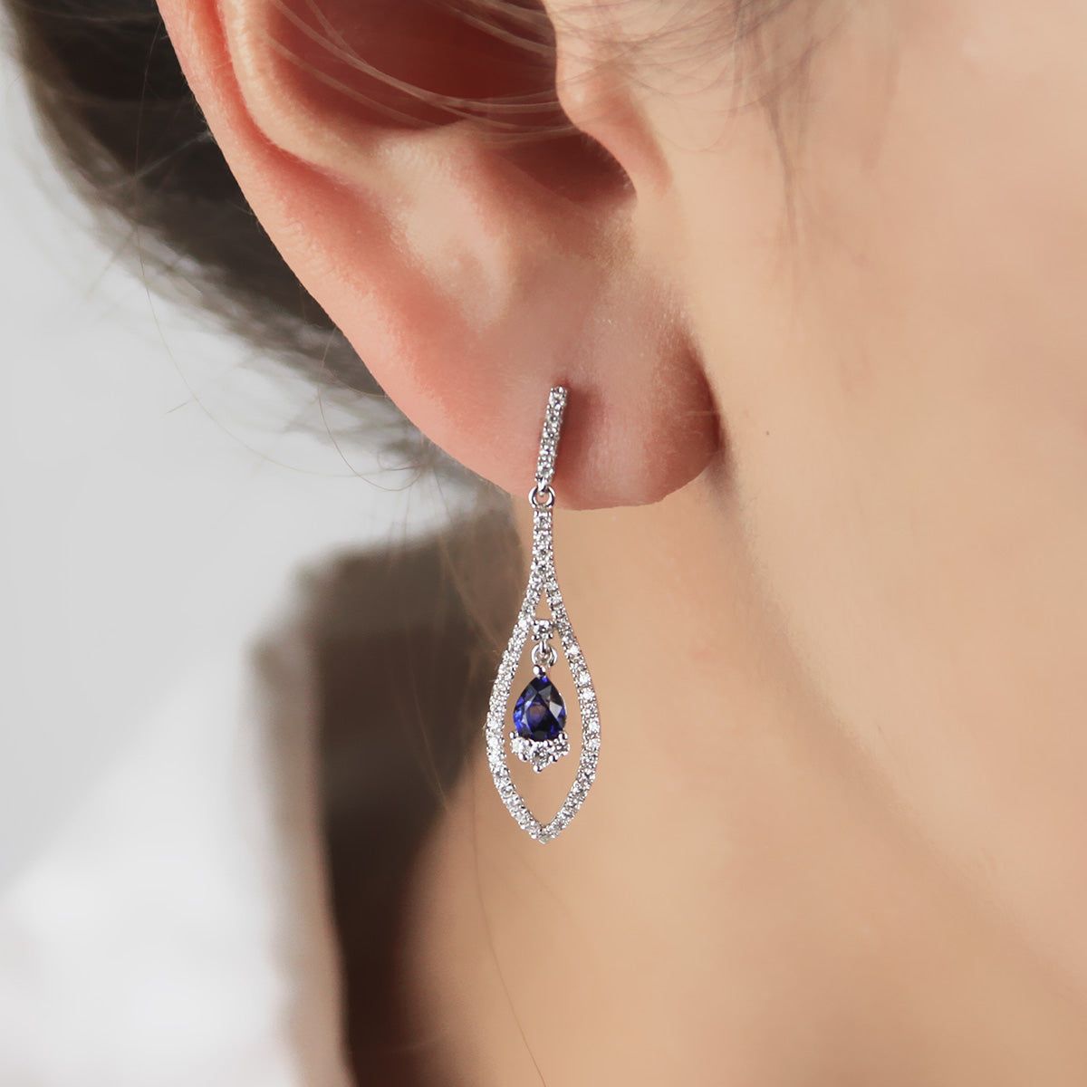 Vivid pear shaped blue sapphires float within halos of brilliant white diamonds in these dangle drop earrings from the Parade in Color Collection.