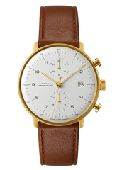 This Junghans men's luxury chronograph watch (MPN: 27/7800.02) features an analog display, 40mm gold stainless steel case, white dial, and brown leather strap. Water-resistant to 30 meters, with a classic round shape