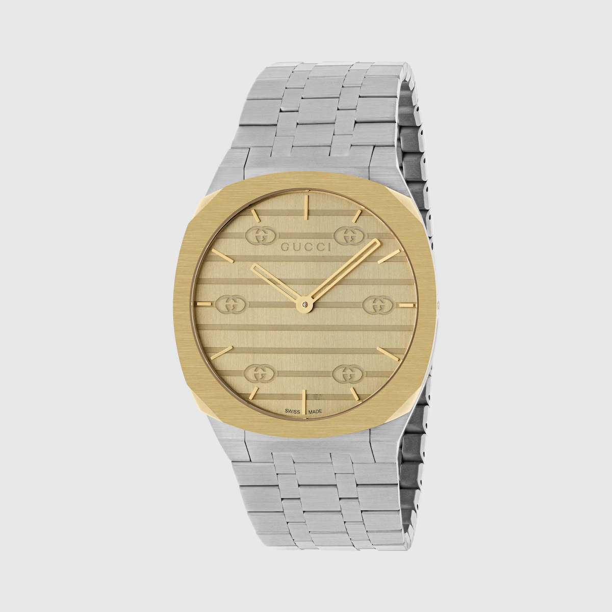 Strap MaterialThe GUCCI 25H's streamlined silhouette was inspired by the sleek forms of contemporary architecture. The watch is presented with a gold-plated multi-layer case with a five-link steel bracelet. The name