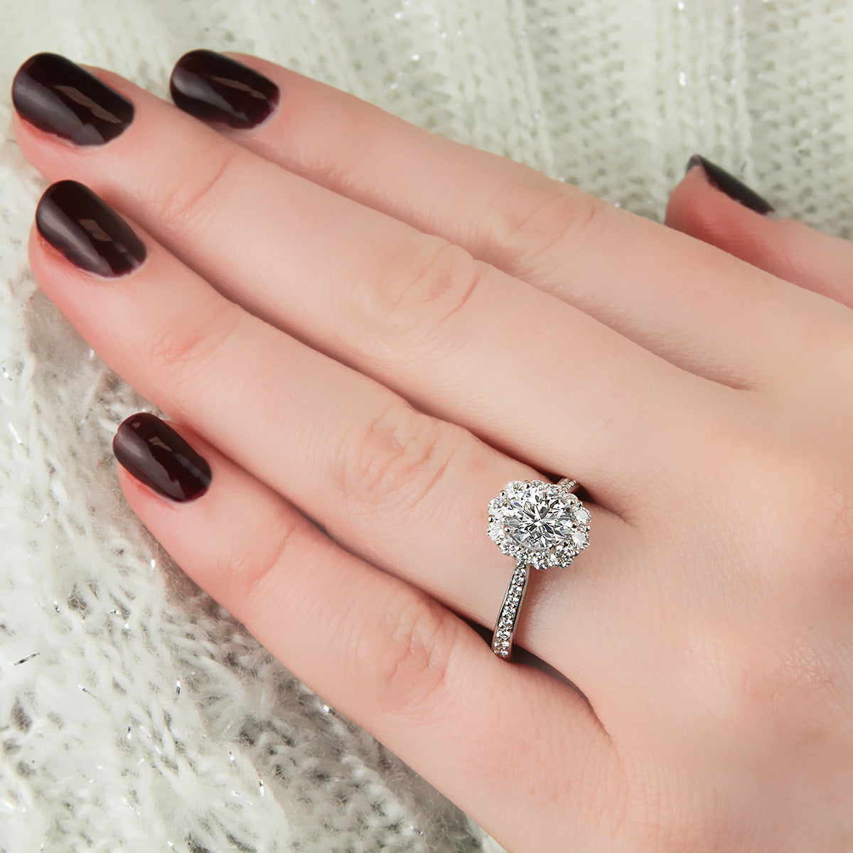 A tapered, sparkling band leads up to an elongated halo featuring graduated round brilliant diamonds that highlight a brilliant center stone.