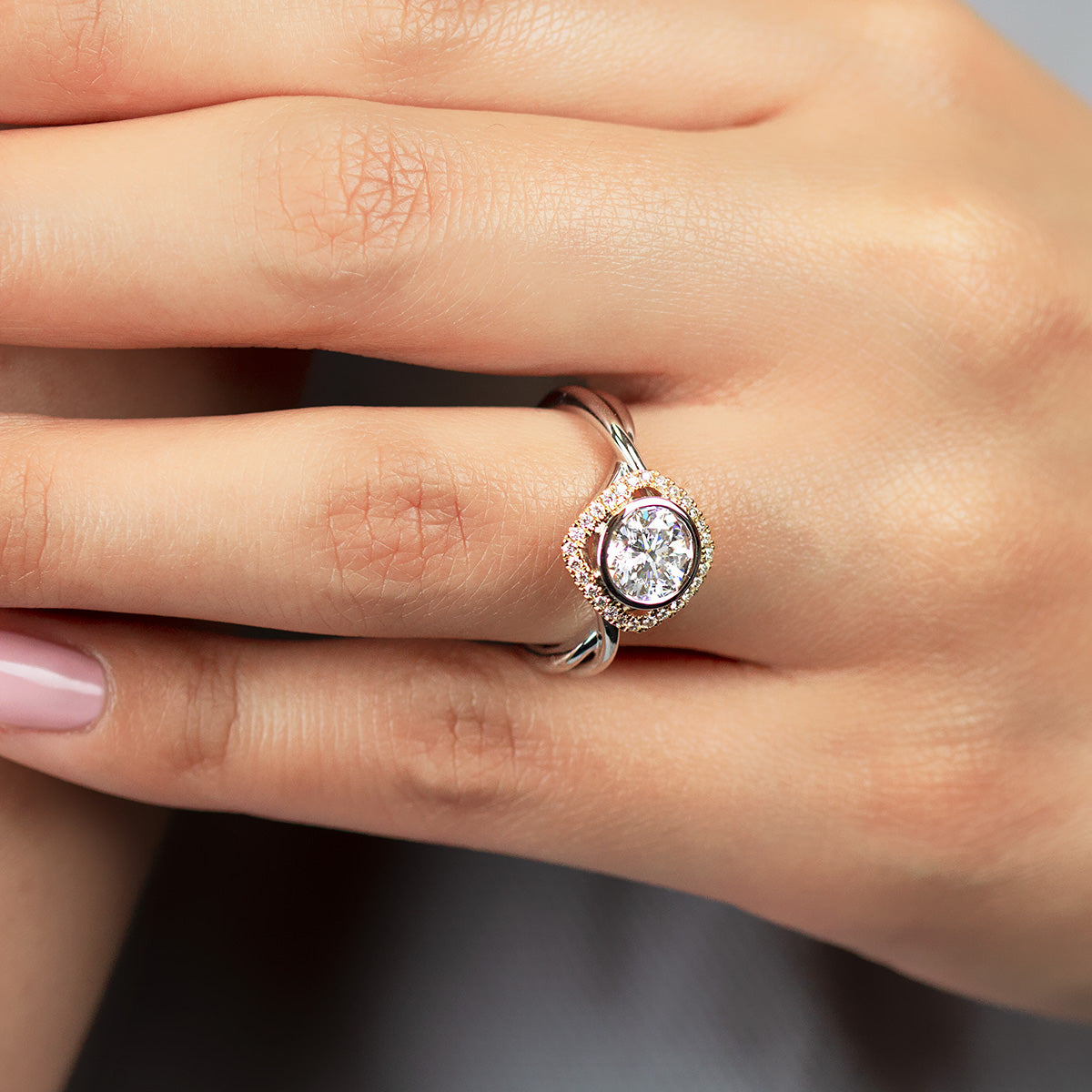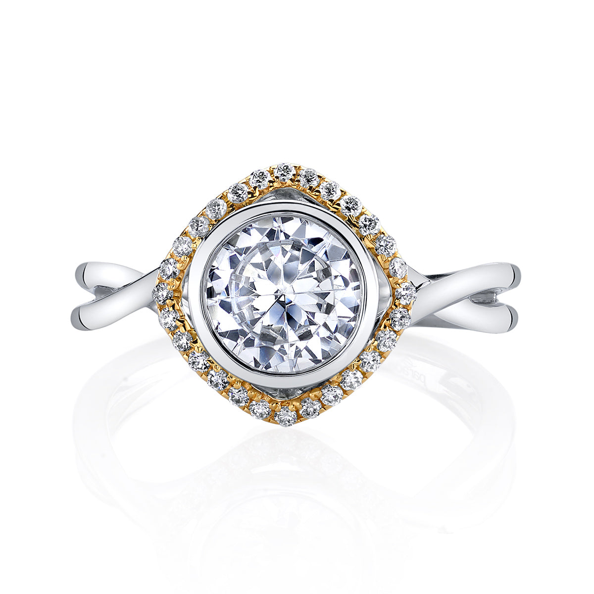 A contemporary design featuring a cushion shaped open halo of brilliant white diamonds around a bezel set round center stone, atop a split band of gleaming high polished gold, from the Hemera Bridal Collection.