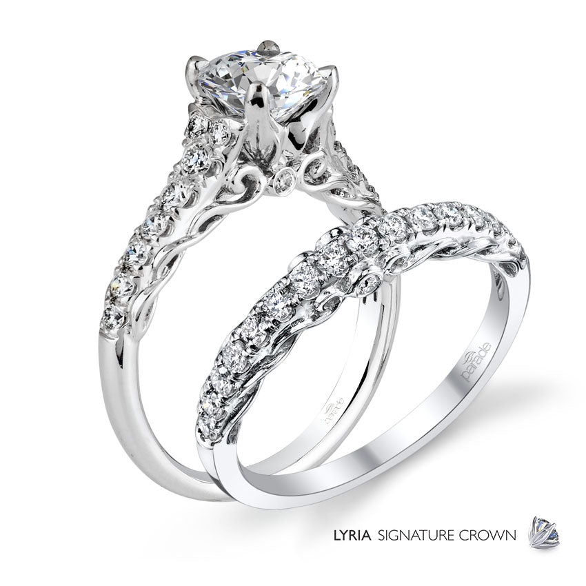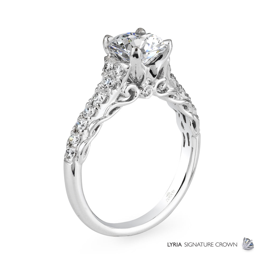 High polished 18K gold weaves through open space as a brilliant round diamond sits atop our Lyria Signature Crown.