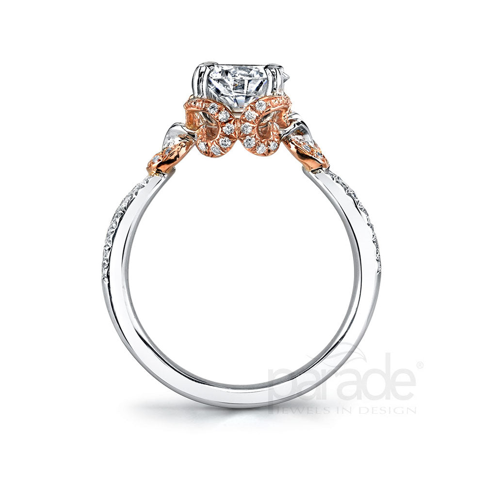 A brilliant-cut diamond is set in the midst of sparkling diamonds that crisscross and curl creating a playful yet chic two-toned look from the Hemera Collection.