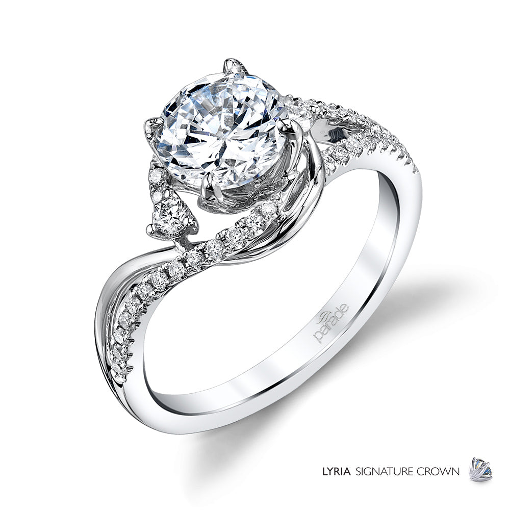 Sweeping curves of diamonds and sleek high polished 18k gold spotlight a brilliant center stone, set in Parade’s Lyria Signature Crown.