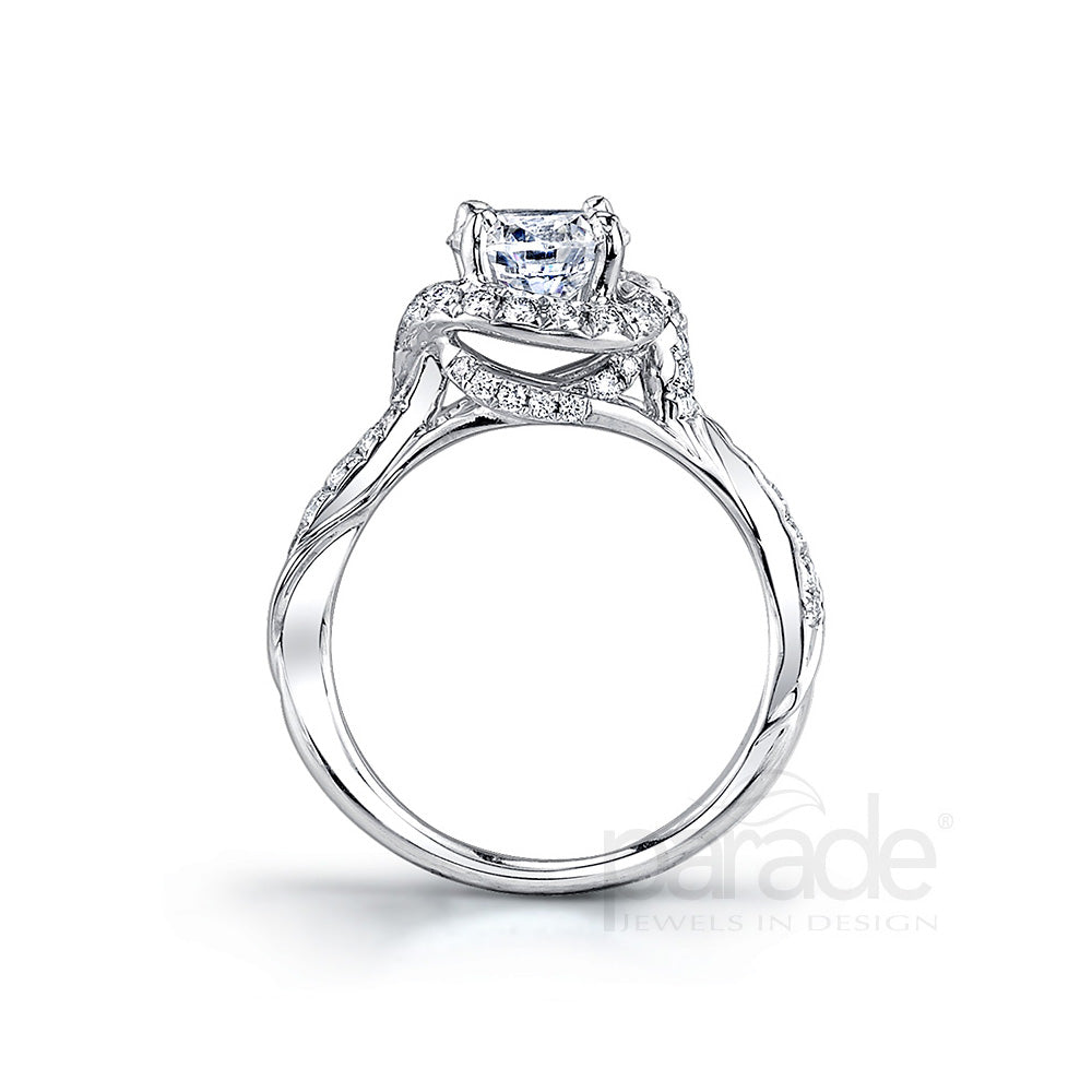 Intertwining bands of diamonds and high-polished gold encircle a brilliant center stone in this sculpturally sophisticated piece.