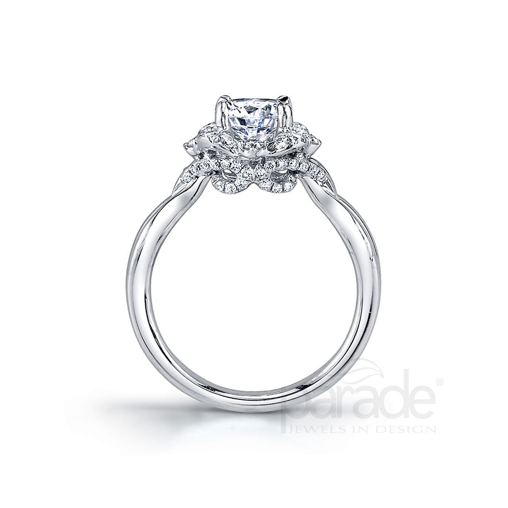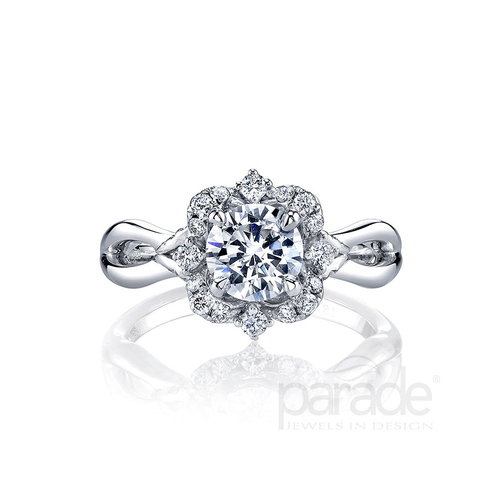 A gleaming split shank and artistic halo of twisting diamonds elevate a brilliant center stone.