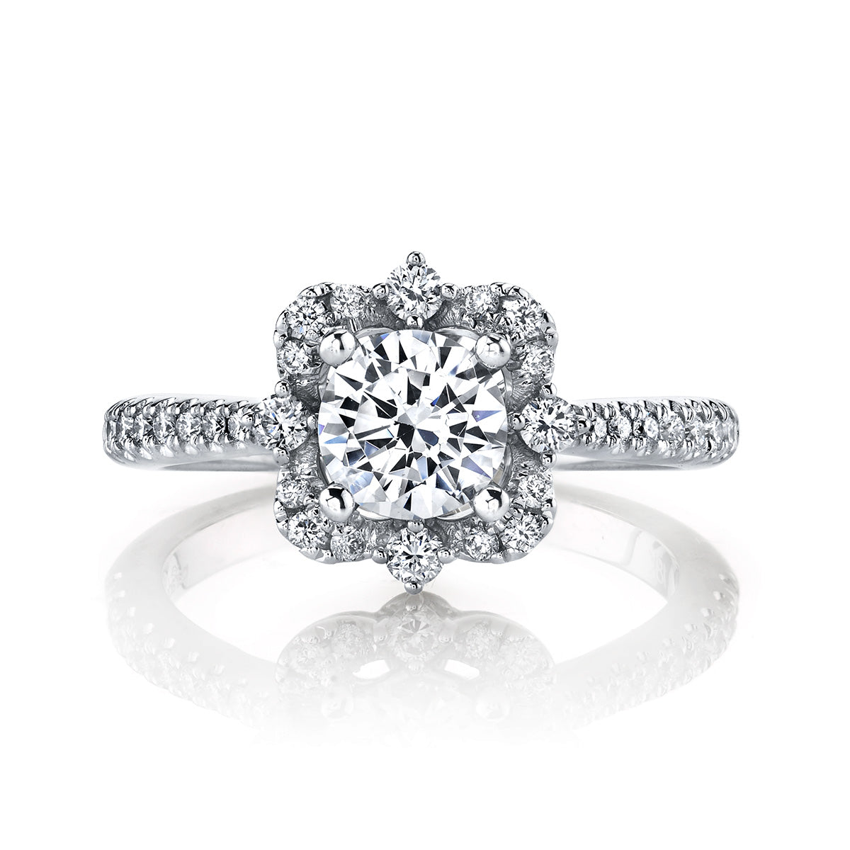 A brilliant center diamond sparkles within an artistic diamond halo, sitting atop a gleaming tapered diamond band.
