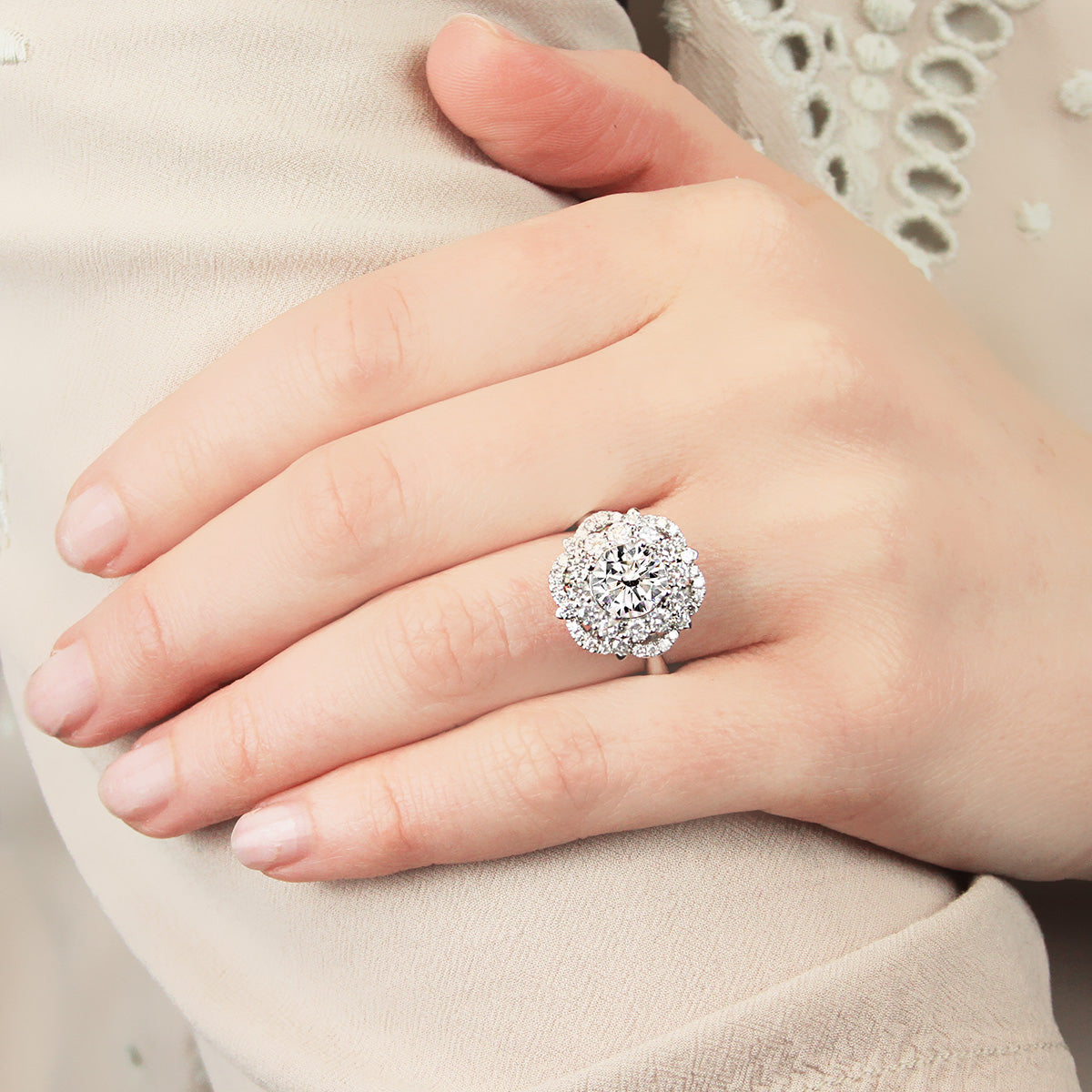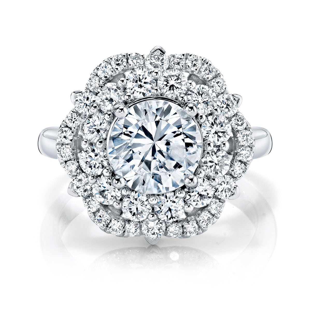 A unique and artistic halo of round brilliant cut diamonds in a vintage-inspired and feminine design perfectly frame a brilliant center stone, finished with a high polish band.