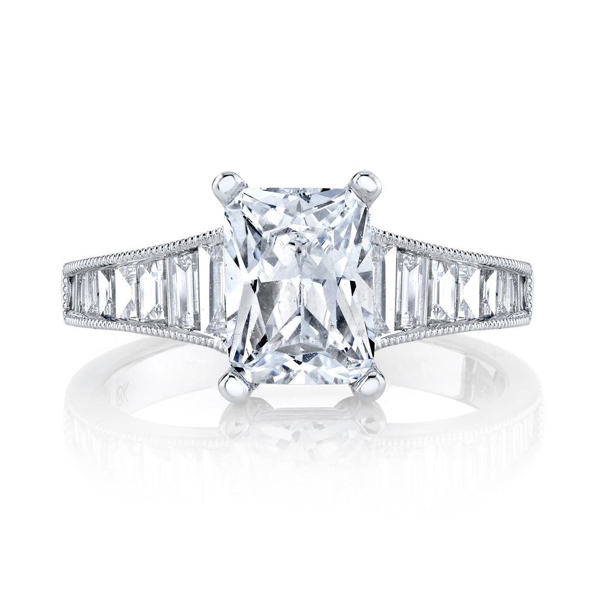This classic design features a stream of ascending baguette diamonds that leads to an octagonal beauty.