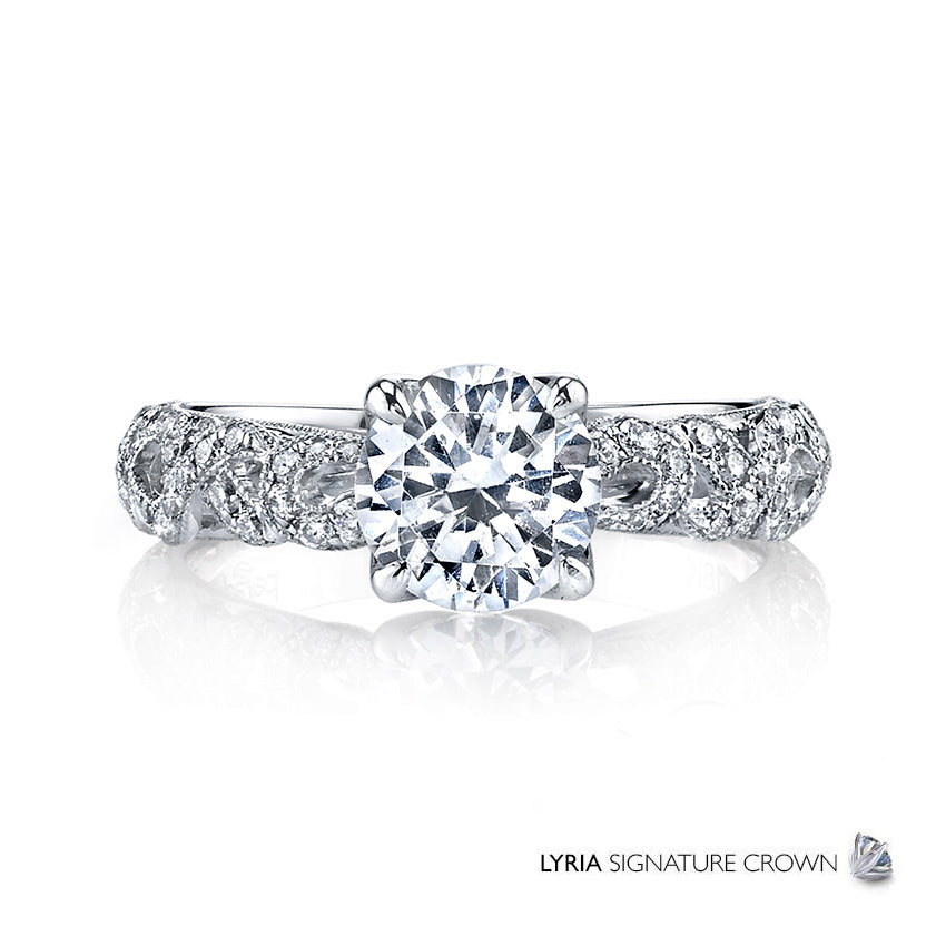 Tapered bands of delicate diamond scrolls climb to a brilliant diamond, set in Parade’s Signature Lyria Crown.