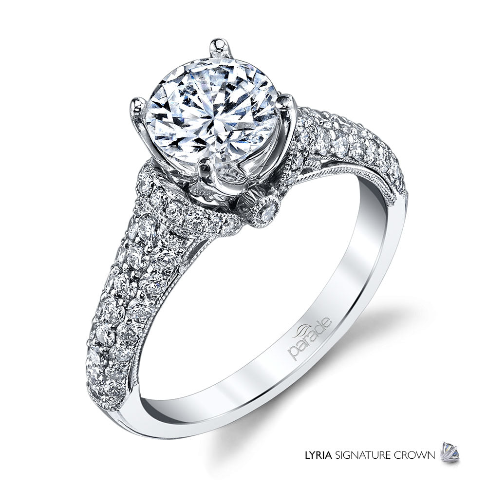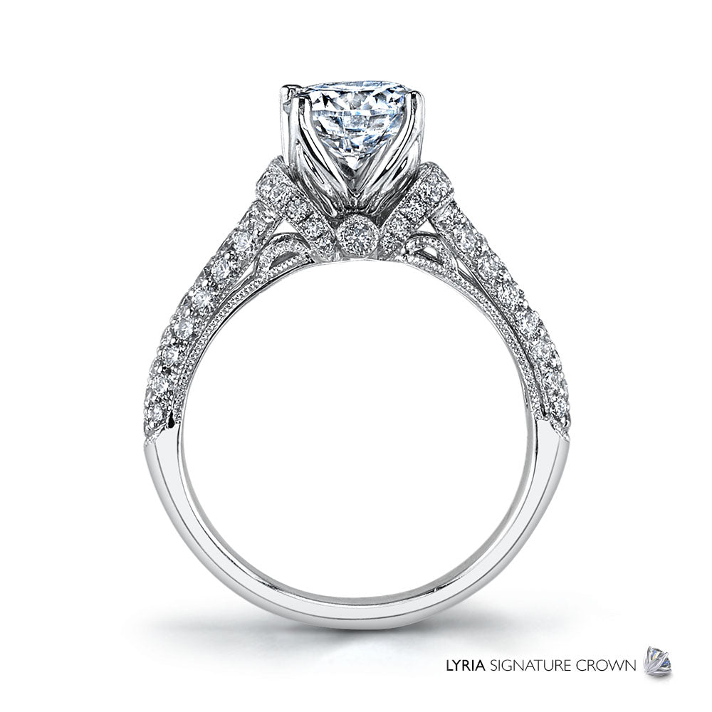 Breath-taking from every angle, the LYRIA Signature Crown presents a brilliant center stone wrapped in rows of sparkling white diamonds and intricate filigree detailing.