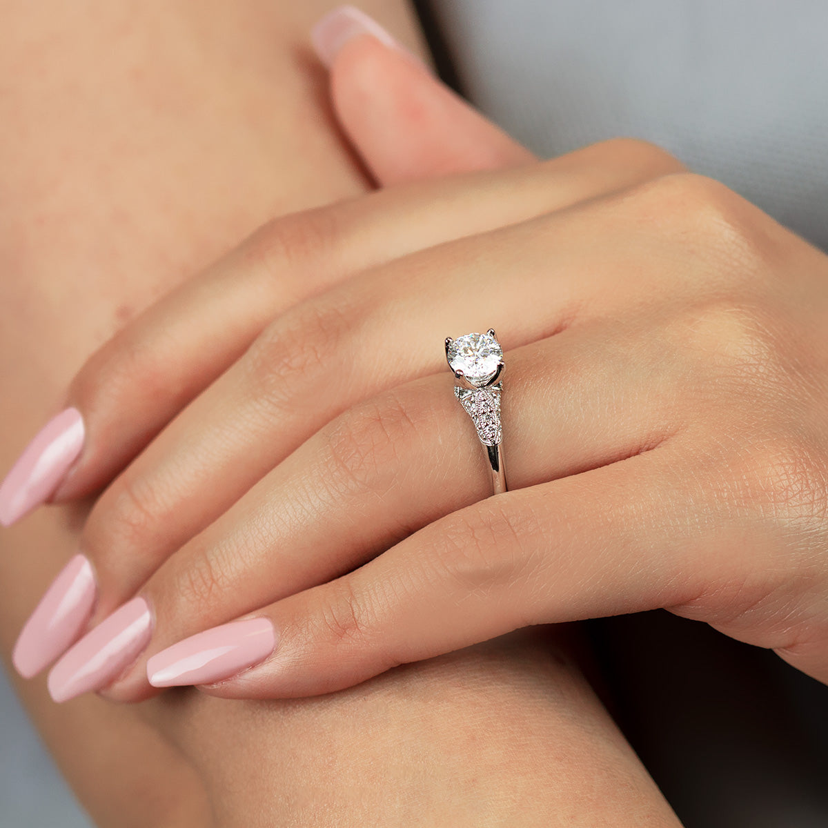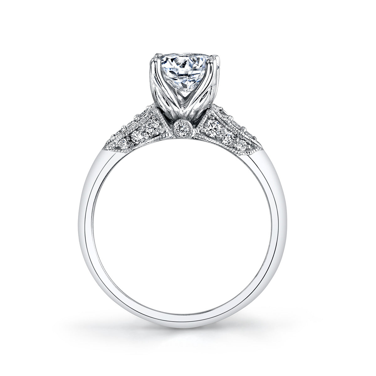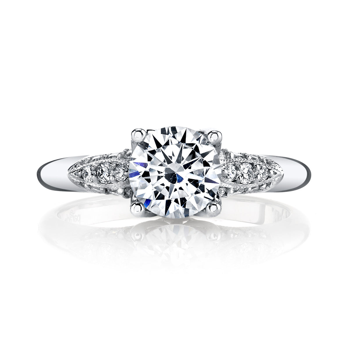 A subtle touch of shining white diamonds set in intricate milgrained gold perfectly highlight a brilliant center stone set in the Lyria Signature Crown.
