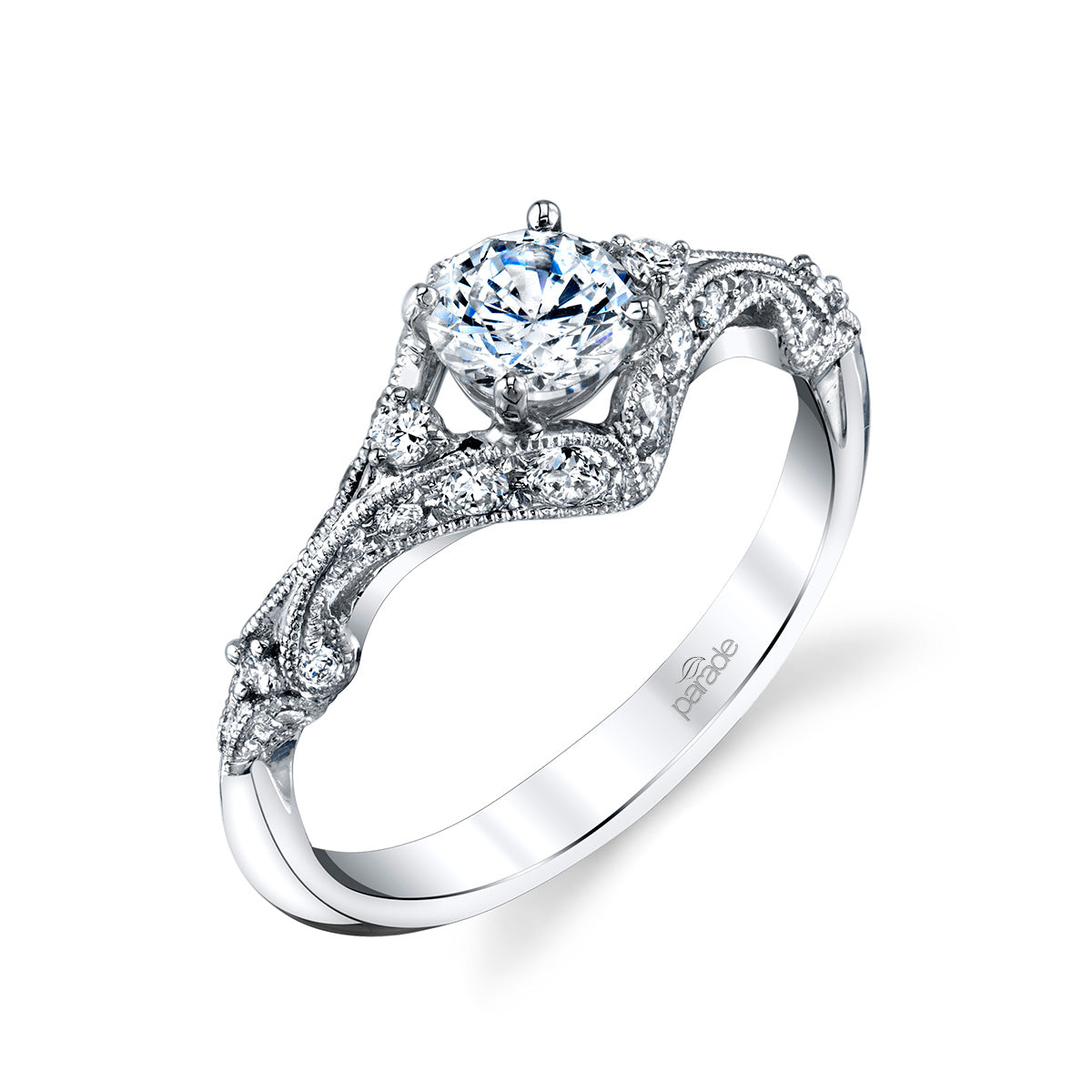 A brilliant center stone floats atop scrolling diamond set arches, finished with intricate milgrain detailing, in this stunning vintage inspired design from the Hera Bridal Collection.