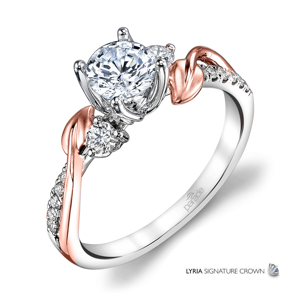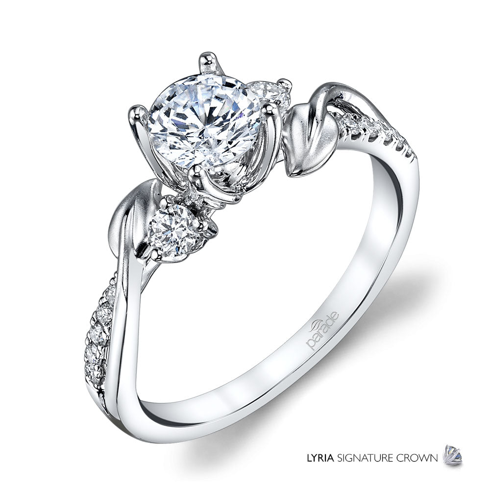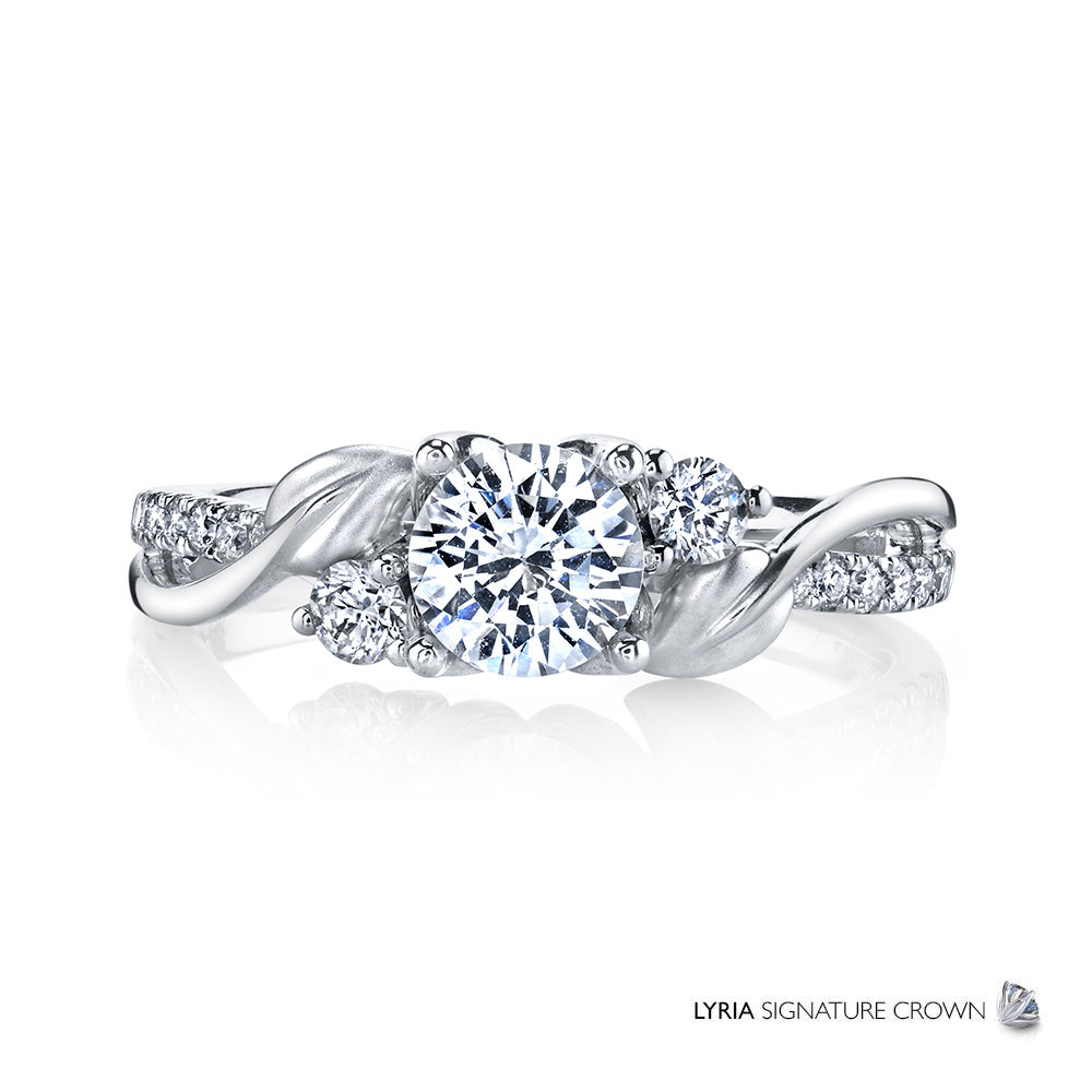Intertwined satin finished leaves and bands of sparkling white diamonds climb towards a brilliant center stone set in the LYRIA Signature Crown.