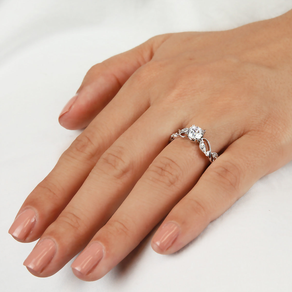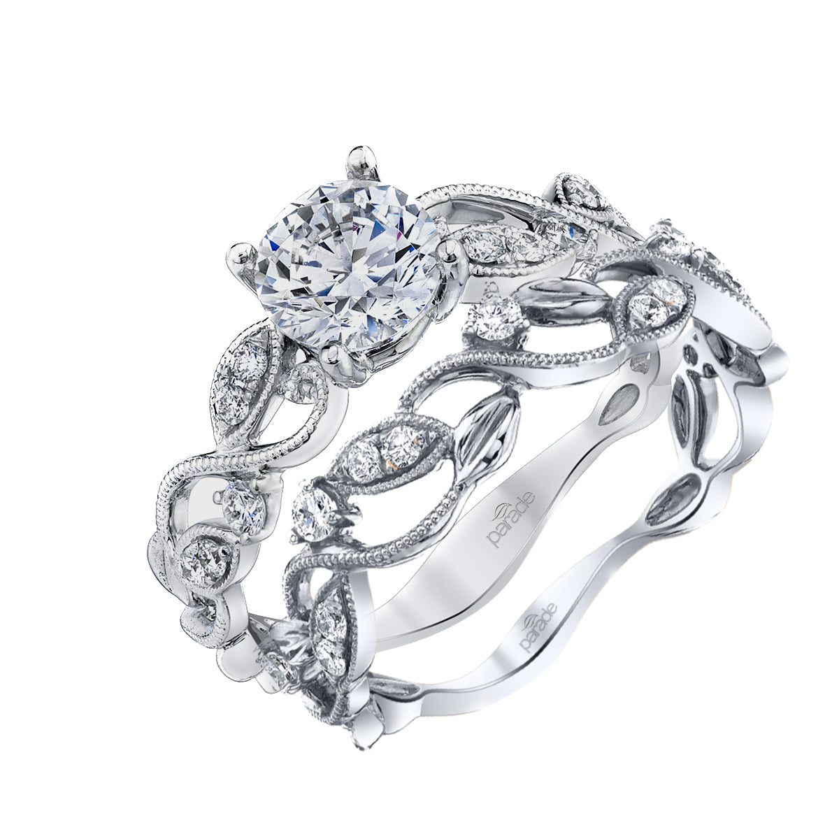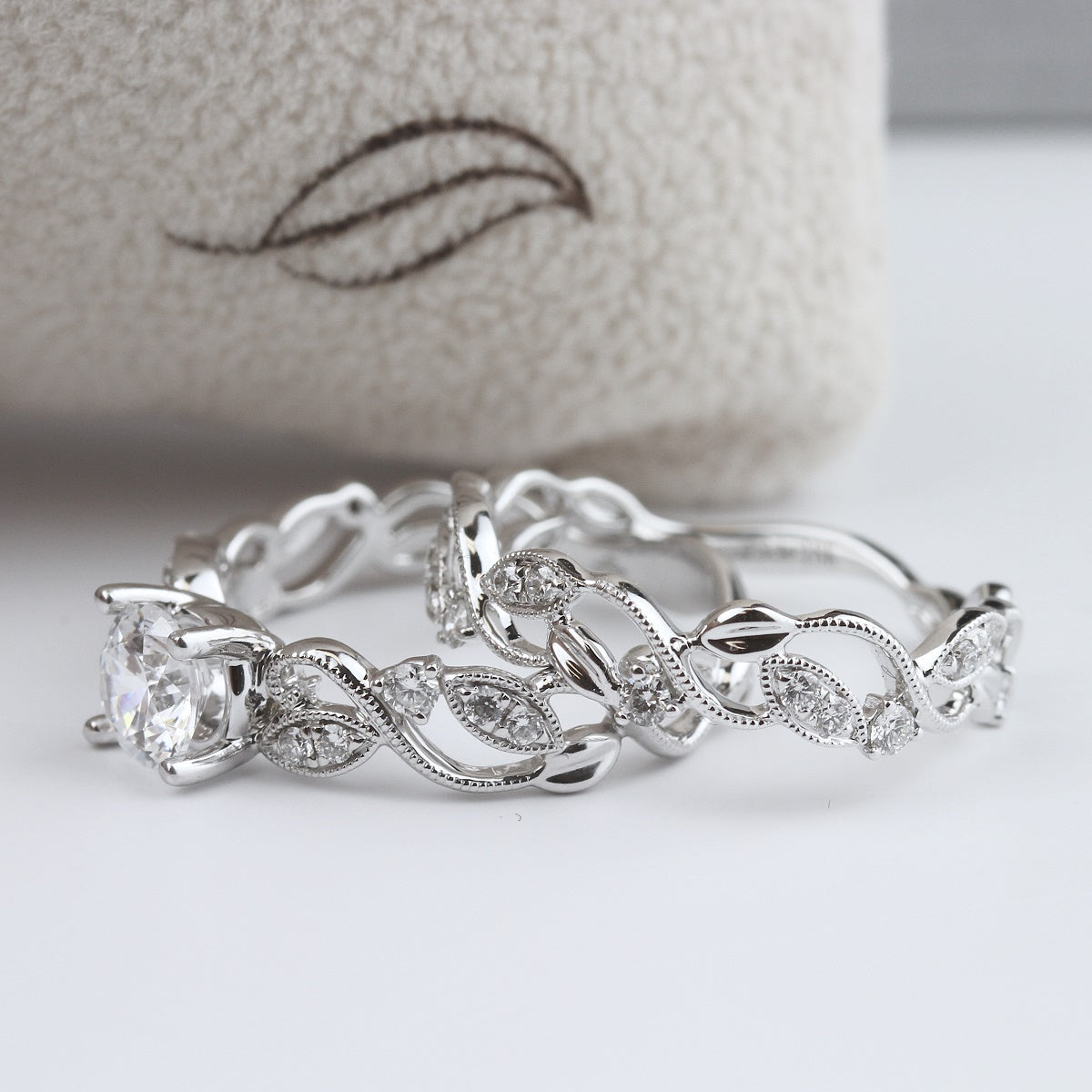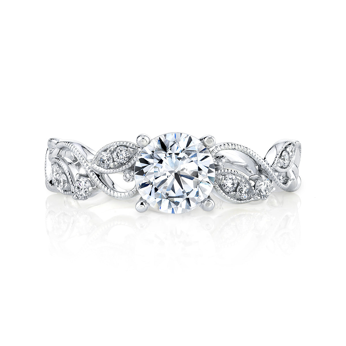 A gleaming band of diamond leaves weave towards a brilliant center stone in this design from the Lyria Leaves Collection.