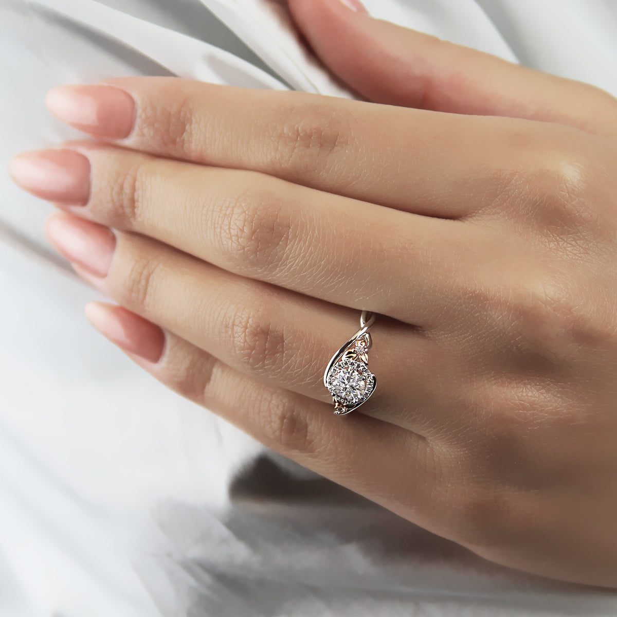 A brilliant center stone sits within a diamond halo atop soft petals of warm rose gold and sparkling white diamonds along intertwined branches of high polished 18K gold in this organic design from the Lyria Bridal collection.