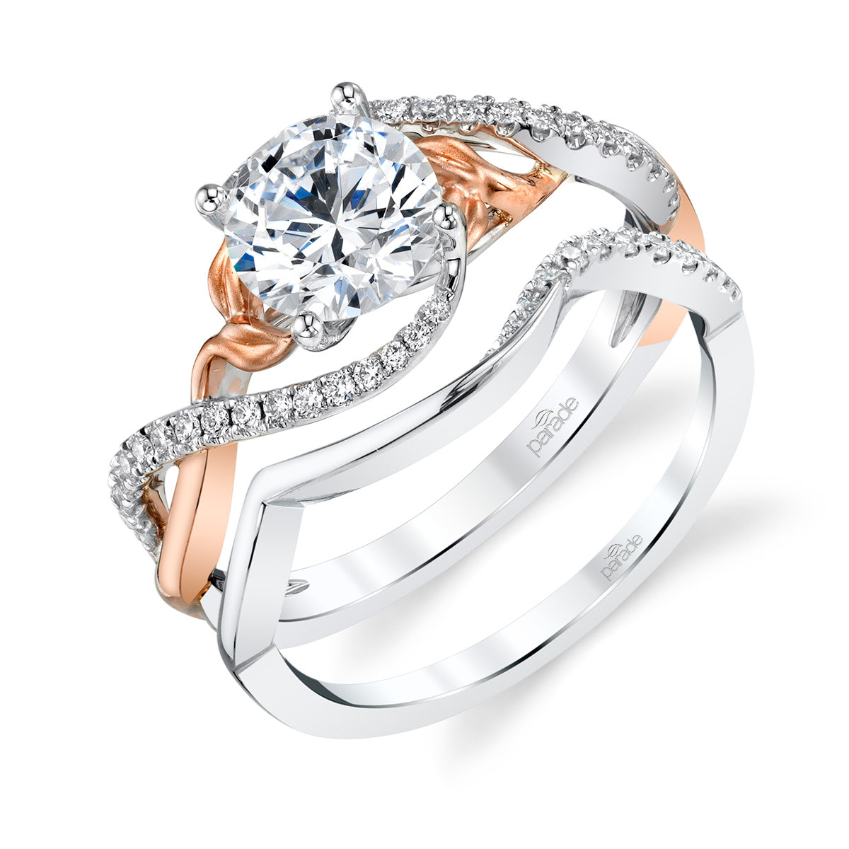 A brilliant center stone sits atop soft petals of warm rose gold and ribbons of sparkling white diamonds in this organic design from the Lyria Bridal collection.