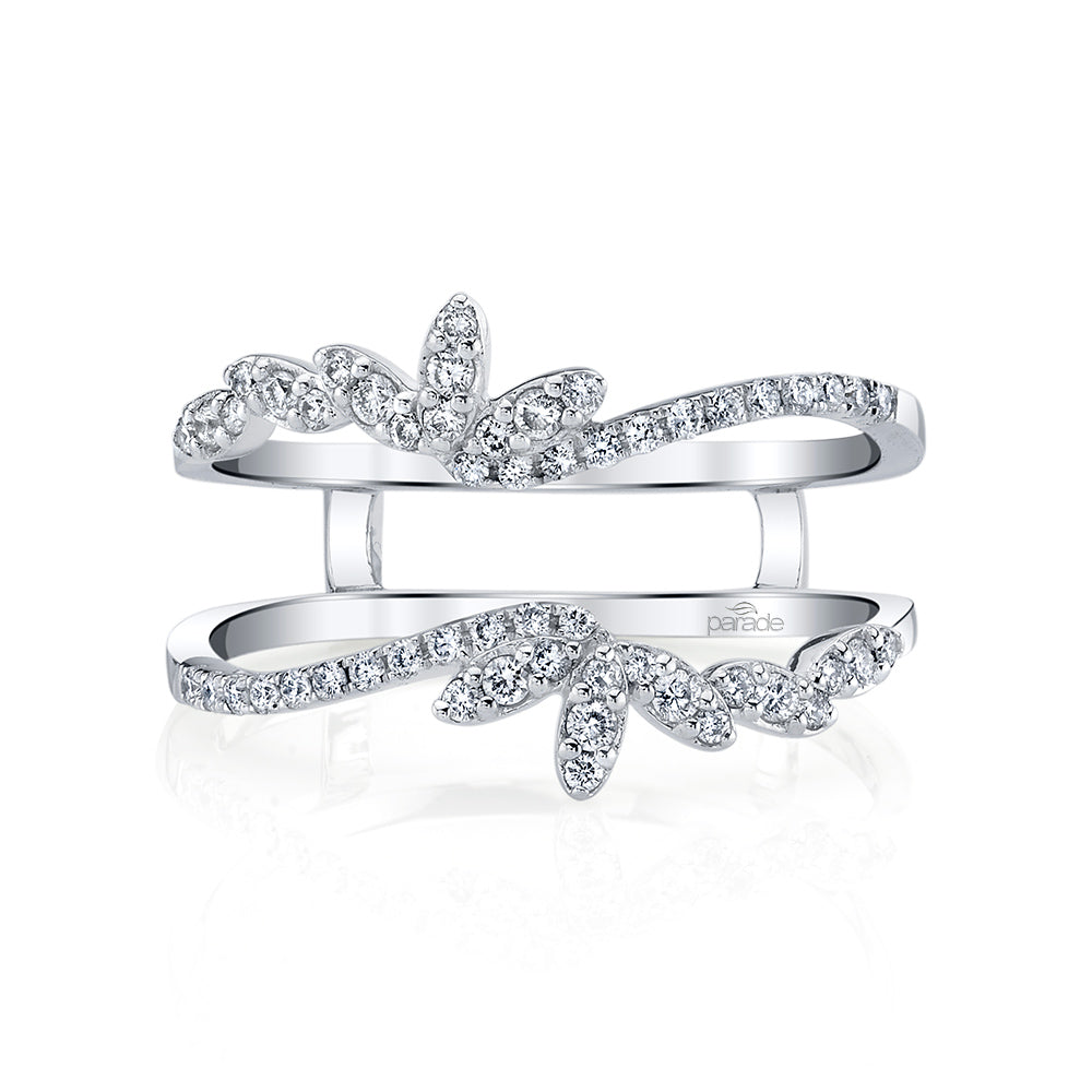 Diamond leaves and stems envelope and accentuate your engagement ring, in this ring guard from the Lyria Bridal collection.