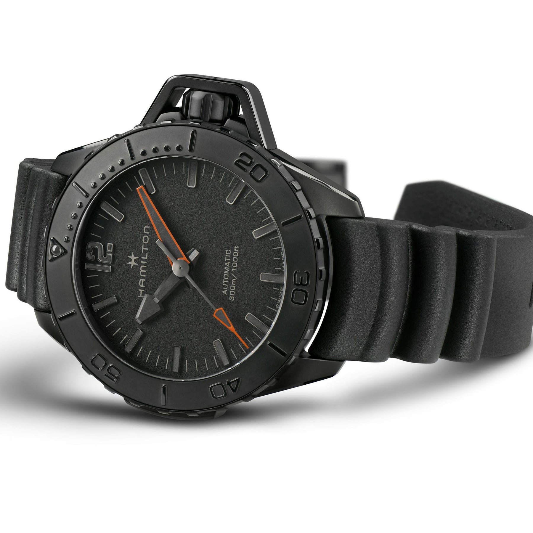 With an intrepid new look, the Khaki Navy Frogman Automatic is Hamilton’s most technically capable maritime-ready watch. Engineered for accuracy, legibility and endurance, the precision instrument brings the unfathomable power of the ocean to the wrist with a uniquely shaped crown protector and wave-look tactical rubber strap.