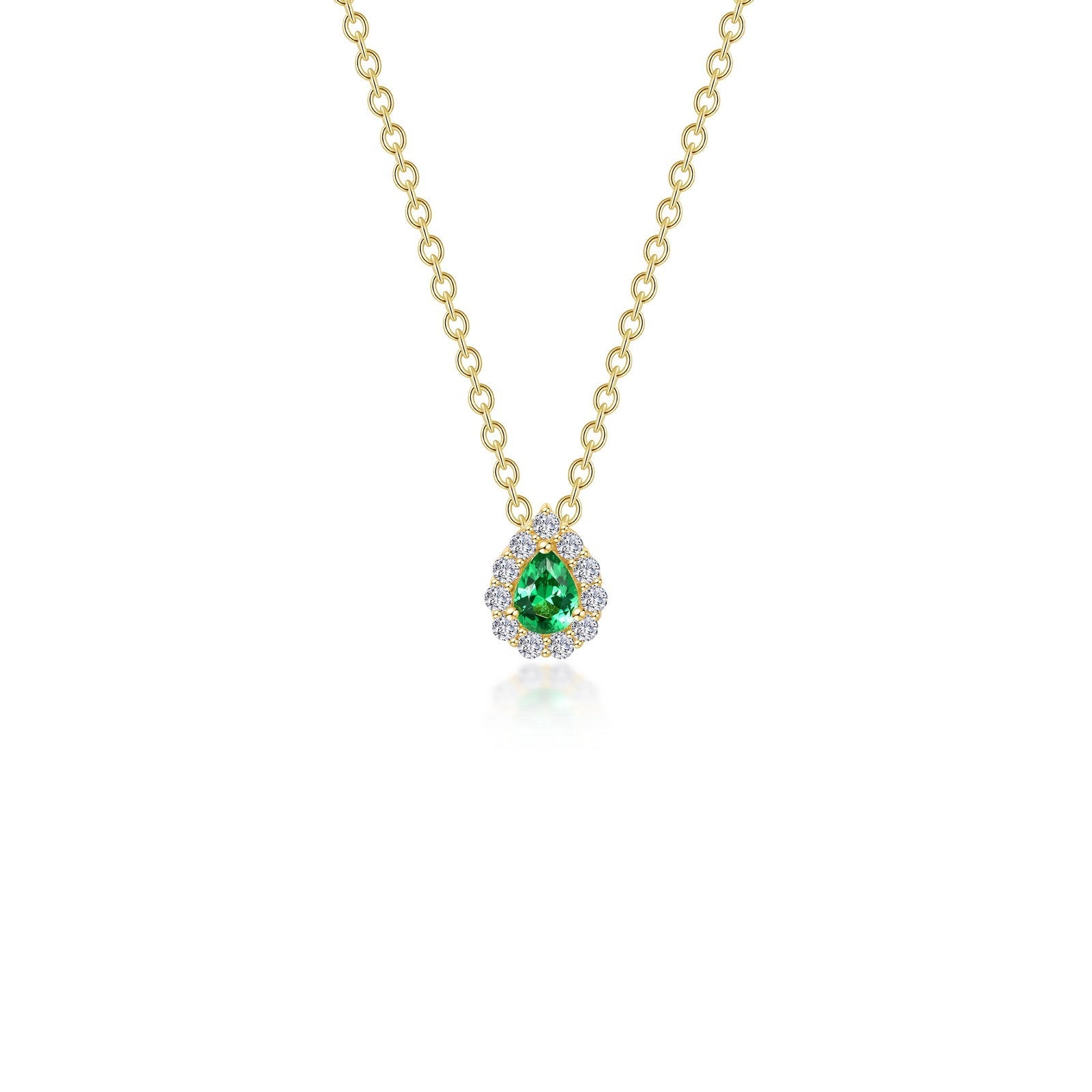 Dainty and charming. This adorable adjustable halo necklace features a pear-shaped simulated emerald surrounded by Lafonn's signature Lassaire simulated diamonds in sterling silver using Lafonn's exclusive TR Gold, a new and improved plating process that preserves the rich color of gold and enhances the wearability of our gold-plated styles.