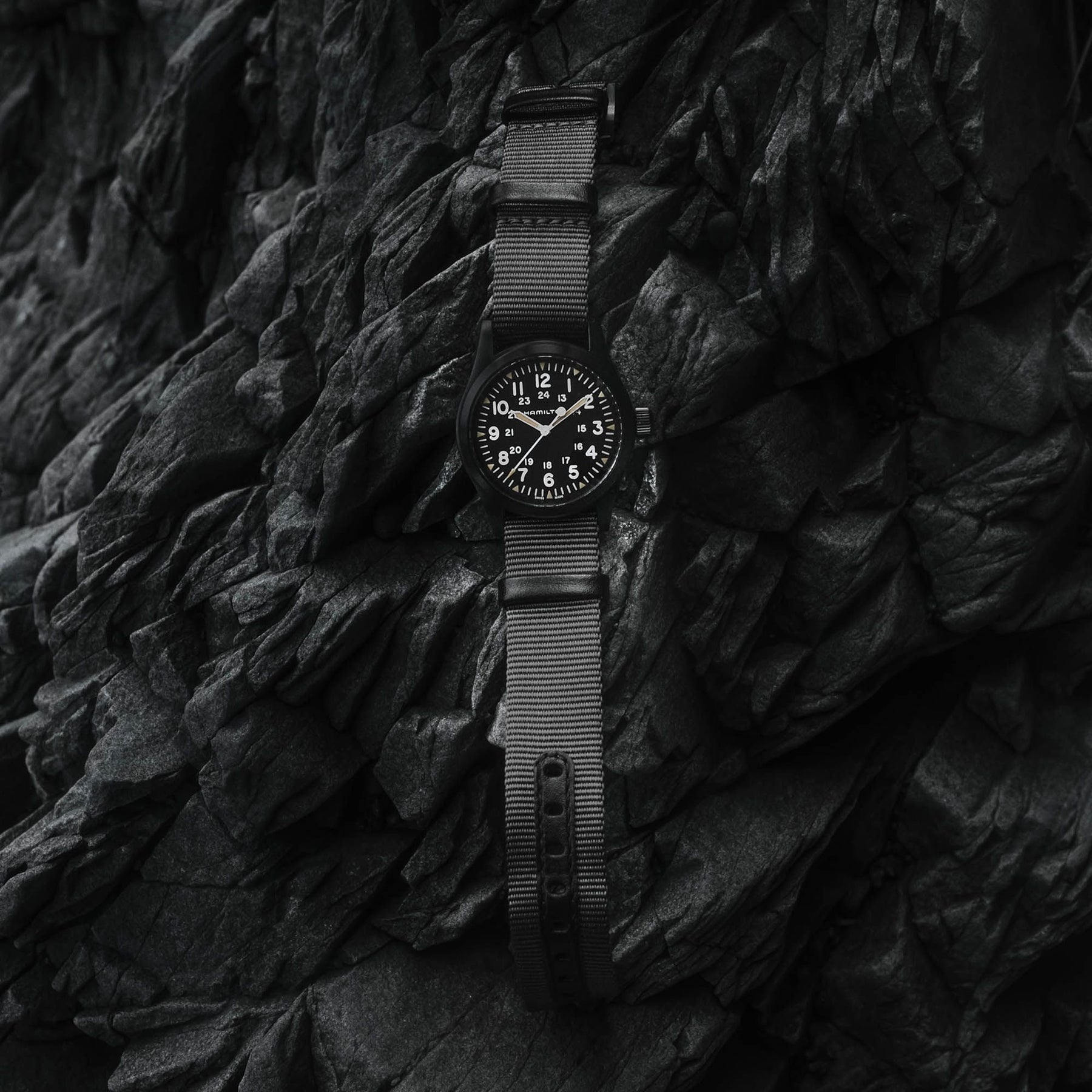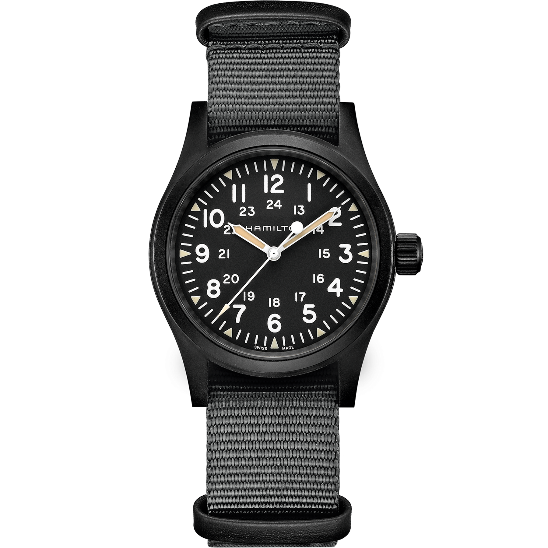 The black and gray color scheme of this Khaki Field Mechanical is a subtle approach to military styling. It is powered by the exclusive H-50 handwinding movement which is housed in a 38 mm case. Triangular indexes with old radium color Super-LumiNova® and a durable NATO strap complete the package.