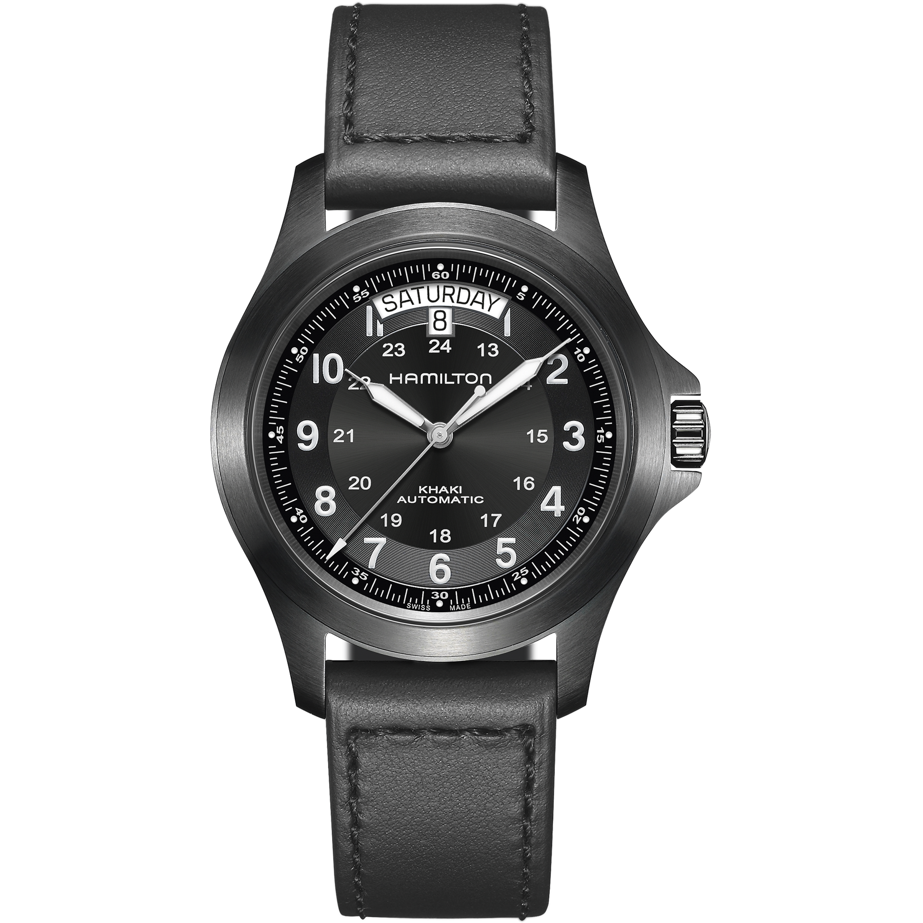 Inspired by Hamilton’s military heritage, our field watches are rugged and resilient. Perfect for after-dark heroics, the Khaki Field King Auto features a black PVD-coated case, black dial and black leather strap for the ultimate in stealth style.