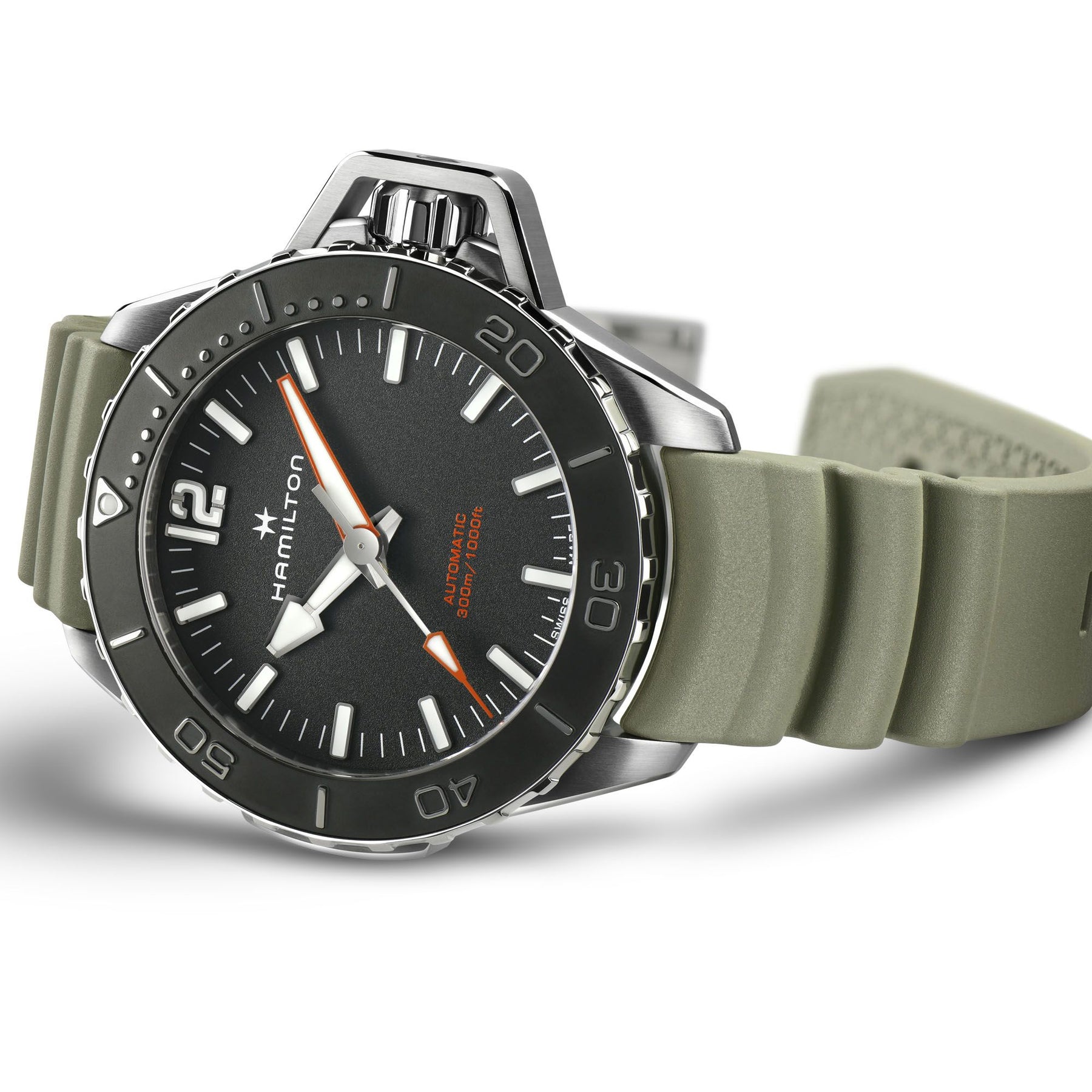 With an intrepid new look, the Khaki Navy Frogman Automatic is Hamilton’s most technically capable maritime-ready watch. Engineered for accuracy, legibility and endurance, the precision instrument brings the unfathomable power of the ocean to the wrist with a uniquely shaped crown protector and wave-look tactical rubber strap.