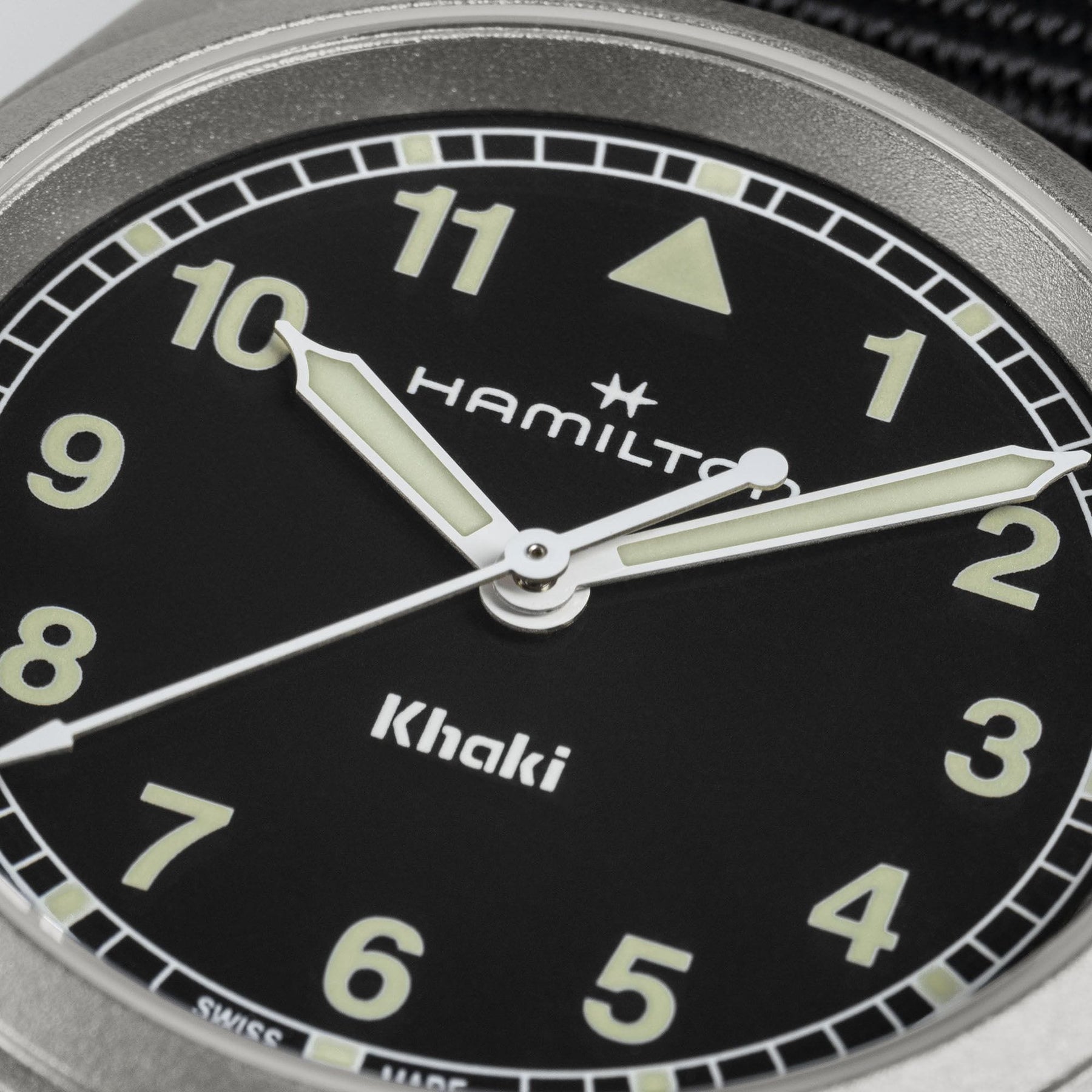 The Khaki Field Quartz expresses a return to Hamilton's military heritage through simplicity in design. The dial features a clear typography with straighter Arabic numerals and a "railway" minute track. The color palette is understated, with its sleek black dial highlighted by light green Super-LumiNova® indexes. The watch comes with a black textile NATO strap and black leather loops - perfect for your next adventure out in the field.