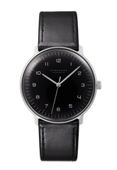 This watch features a 38mm stainless steel case, self-winding J800.1 movement with 38-hour power reserve, anti-reflective sapphire crystal, polished black dial with luminous hands, 5-bar water resistance, and leather strap