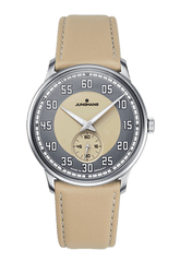 This Junghans men's luxury watch (MPN: 27/3608.02) features an automatic movement, 37.7mm stainless steel case, cream dial, and matching leather strap. Water-resistant to 30 meters, it has a classic round shape.