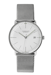 This watch features a 38mm stainless steel case, self-winding J800.1 movement with 38-hour power reserve, date function, sapphire crystal, silver-plated luminous dial, 5-bar water resistance, and Milanaise bracelet.