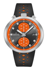 Sports performance encapsulated in a watch: The colour and style are a clear nod to the historic archetype from the 1970s. An anthracite- coloured dial is in stark contrast to the orange of totalisers and tachymeter. The slightly elliptical form lends an extraordinary dynamic to the watch. This model is limited to 1972 units.