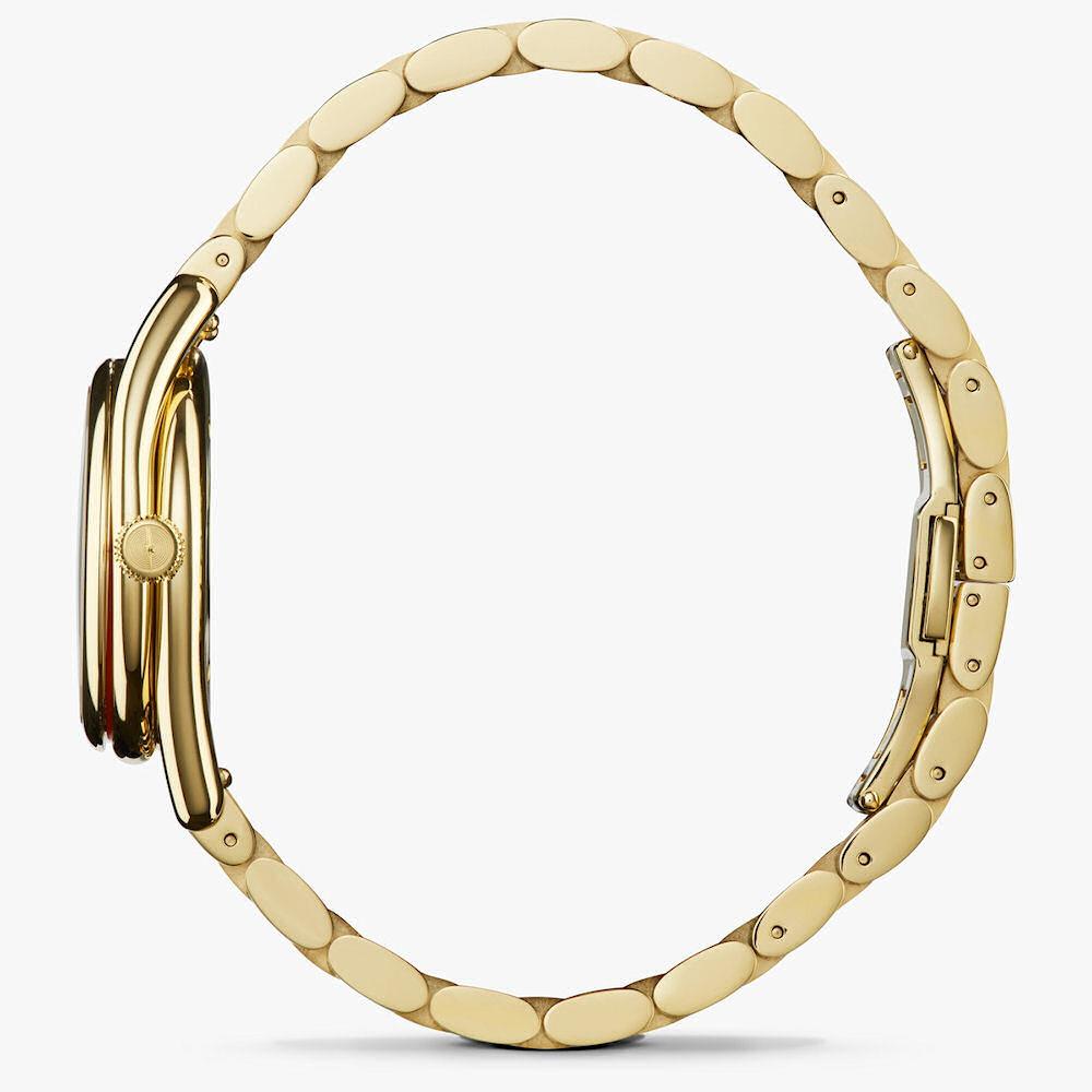 Shinola Detroit Derby Collection Model S0120226478 powered by quarts movement. Olive green dial with Arabic numerals. Comes in gold plated stainless steel case with bracelet. Inspired by the bend of a horseshoe