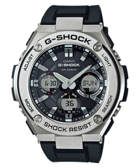 From G-SHOCK, the watch brand that is constantly setting new standards for timekeeping toughness, comes G-STEEL, a watch series with a new "layer guard structure". Different materials are used for the bezel to create a two-layer structure that adds a new dimension of shock resistant. For models that use stainless steel in the upper part, shock absorbing resin is employed in the lower part. If resin is used in the upper part, fine resin is used in the lower part to cushion against impact from the upper part. This also has made it possible create a wide range of different designs. The GST-S110 model expresses the hardness and beauty of metal. A hand shift feature temporarily moves hands out of the way with the press of a button for easy reading of digital display contents, while double LED face illumination keeps information easy to read at all times.