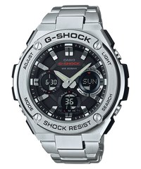 rom G-SHOCK, the watch brand that is constantly setting new standards for timekeeping toughness, comes G-STEEL, a watch series with a new "layer guard structure". Different materials are used for the bezel to create a two-layer structure that adds a new dimension of shock resistant. For models that use stainless steel in the upper part, shock absorbing resin is employed in the lower part. If resin is used in the upper part, fine resin is used in the lower part to cushion against impact from the upper part. This also has made it possible create a wide range of different designs. The GST-S110 model expresses the hardness and beauty of metal. A hand shift feature temporarily moves hands out of the way with the press of a button for easy reading of digital display contents, while double LED face illumination keeps information easy to read at all times.