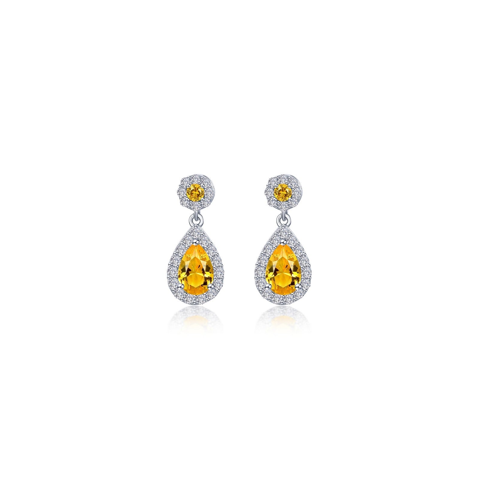 Simple and chic. Each of these charming halo drop earrings features a pear-shaped simulated citrine surrounded by Lafonn's signature Lassaire simulated diamonds. The earrings are in sterling silver bonded with platinum.