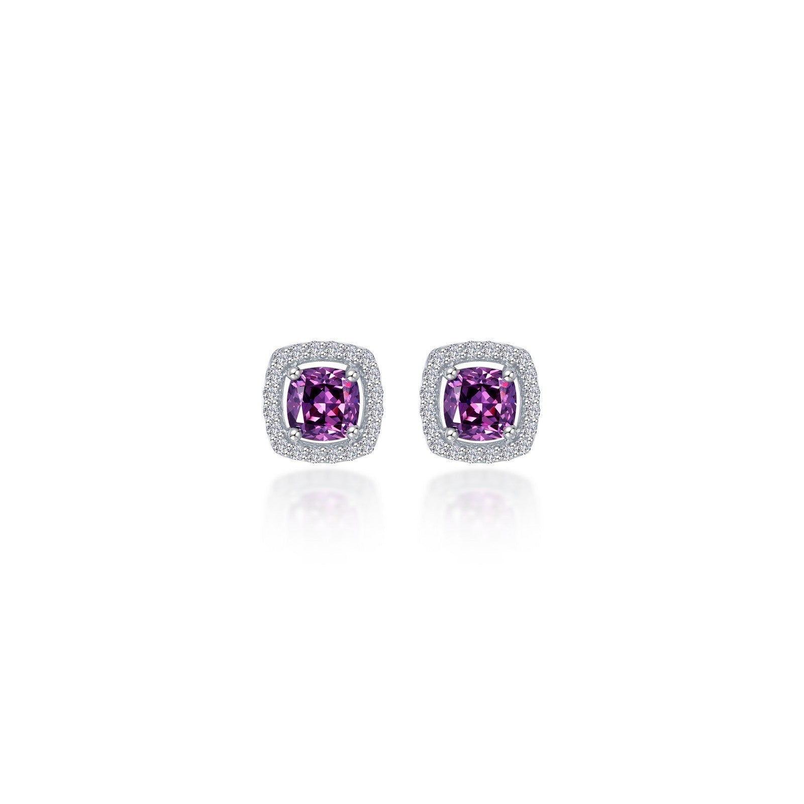 Timeless elegance. Each of these charming halo stud earrings features a cushion-cut simulated amethyst surrounded by Lafonn's signature Lassaire simulated diamonds. The earrings are in sterling silver bonded with platinum.