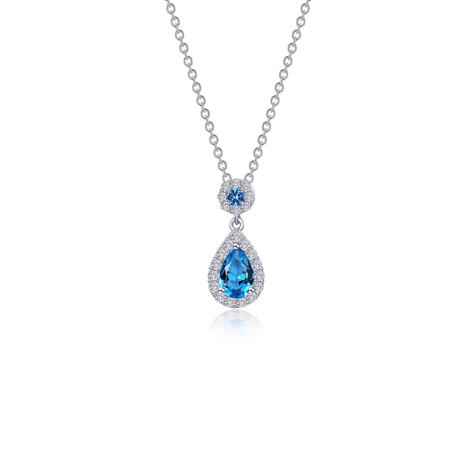 Simple and chic. This charming halo drop necklace features a pear-shaped Swiss Blue simulated diamond surrounded by Lafonn's signature Lassaire simulated diamonds. The necklace is in sterling silver bonded with platinum.