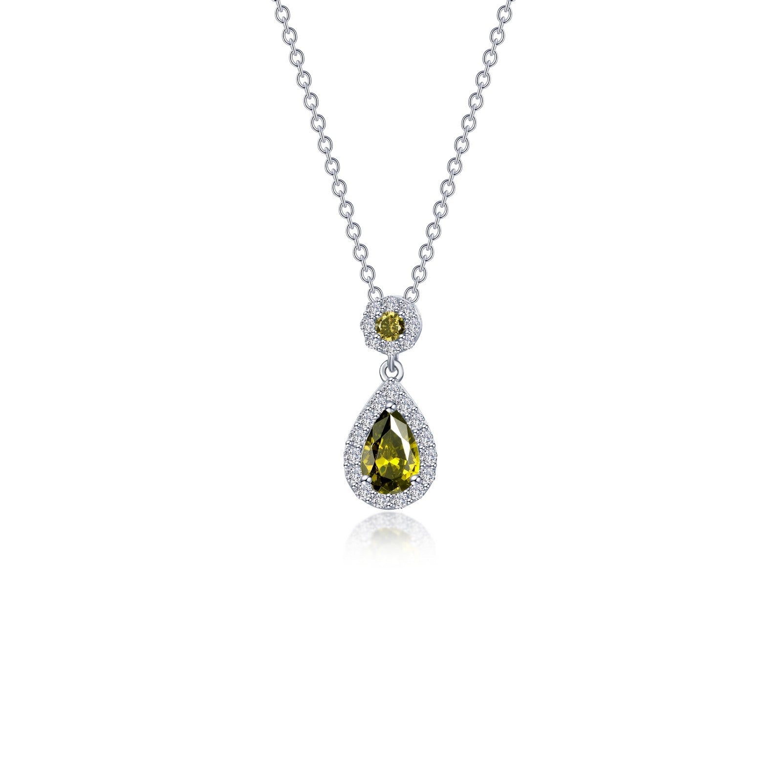 Simple and chic. This charming halo drop necklace features a pear-shaped olive green simulated diamond surrounded by Lafonn's signature Lassaire simulated diamonds. The necklace is in sterling silver bonded with platinum.