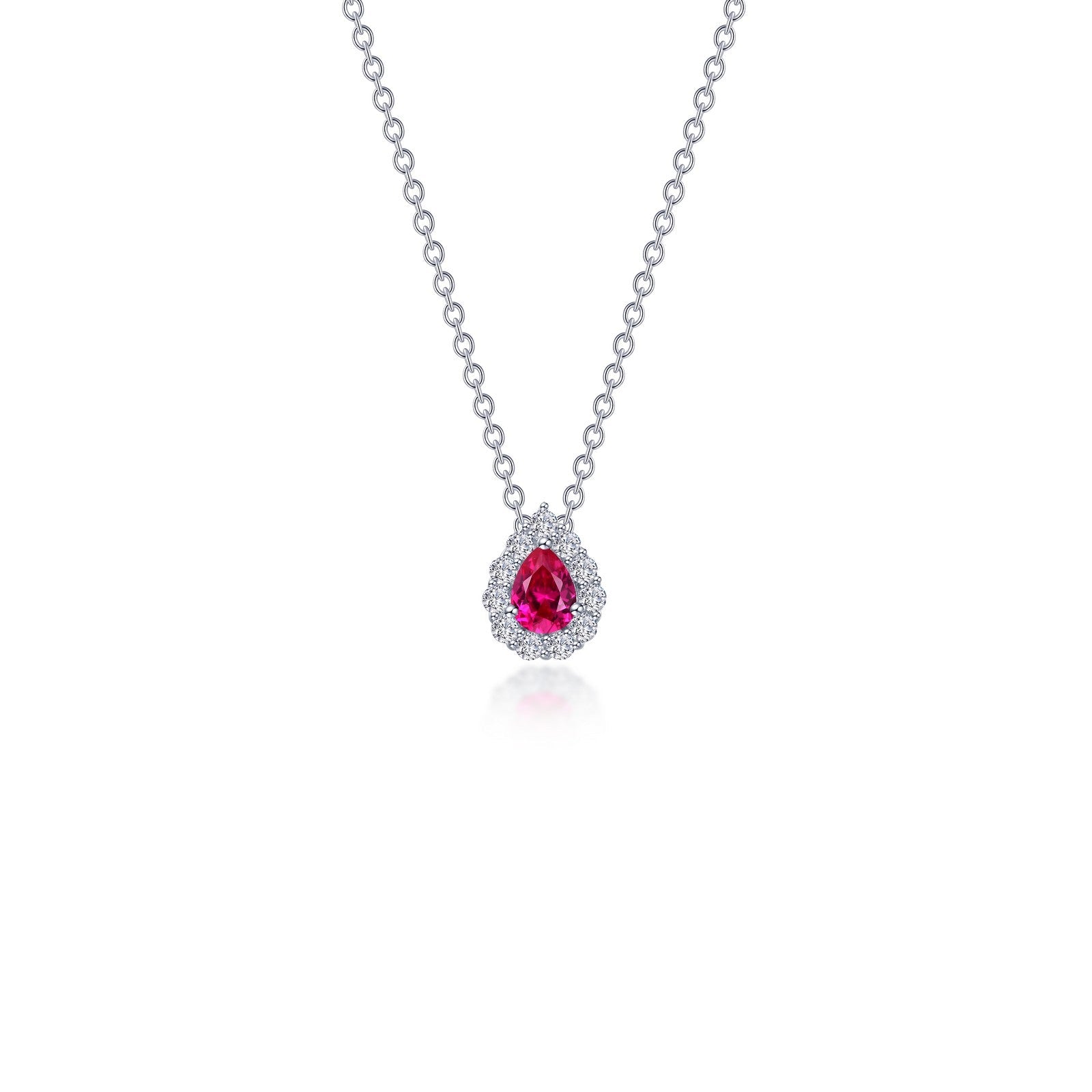 Dainty and charming. This adorable adjustable halo necklace features a pear-shaped lab-grown ruby surrounded by Lafonn's signature Lassaire simulated diamonds. The necklace is in sterling silver bonded with platinum.