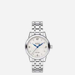 The Bohème Automatic combines the best of fine watchmaking with a distinctive feminine design. Powered by a high-quality automatic movement that can be admired through a sapphire crystal case back, this watch expresses the codes of fine watchmaking in every little detail: the 30 mm steel case with its slightly curved and integrated horns gives this enduring timepiece a very classic yet distinctive personality. The silver-colored guilloché dial with its 90 facets and sophisticated date indication at 6 o'clock offers perfect readability and refined elegance. The leaf-shaped hands in blue with the Montblanc emblem on the seconds hand, the black floral Arabic numerals and the diamond indexes, as well as the minute scale with precious and discrete "filet sauté", will satisfy even the most refined tastes.